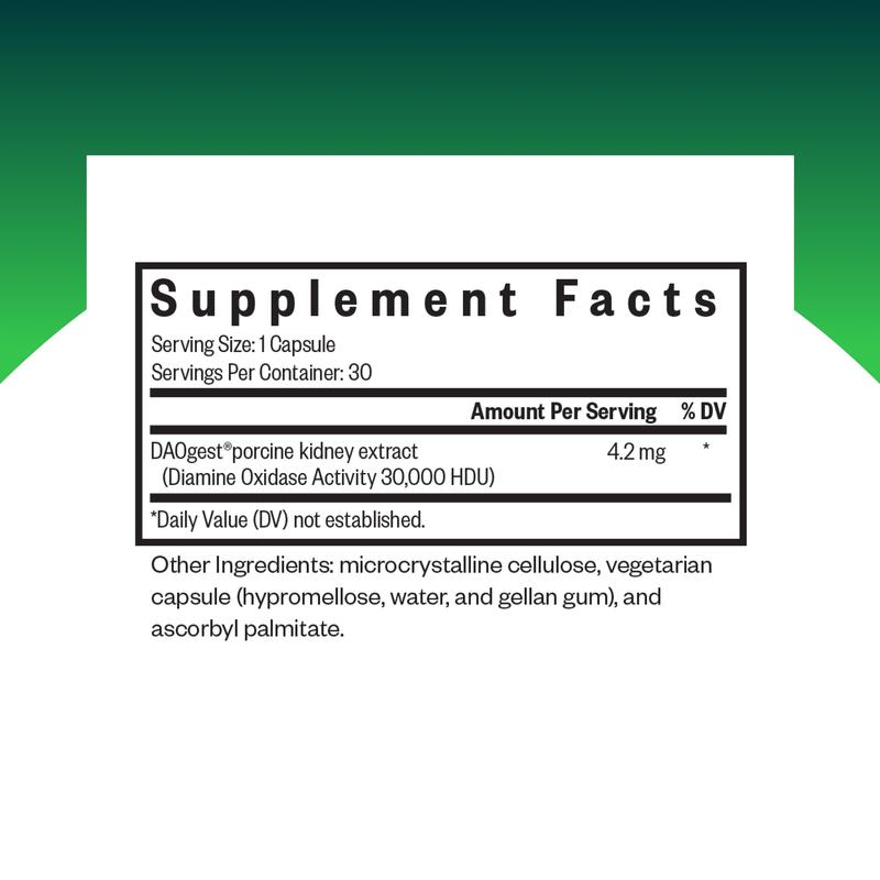 ·Contains Porcine Kidney Extract: Each capsule contains DAOgest, a natural enzyme derived from porcine (pig) kidney extract, providing Diamine Oxidase (DAO) activity to help support histamine metabolism.