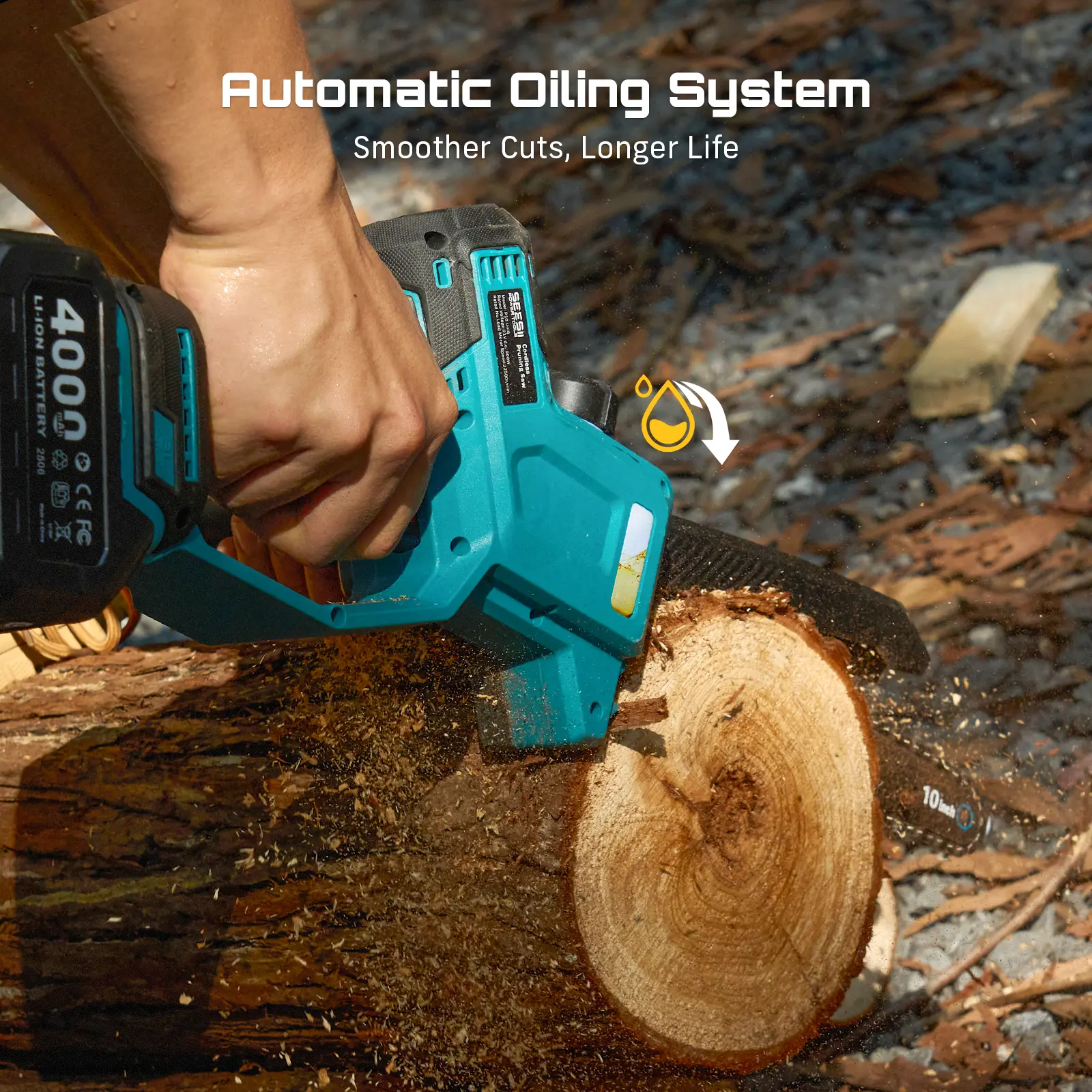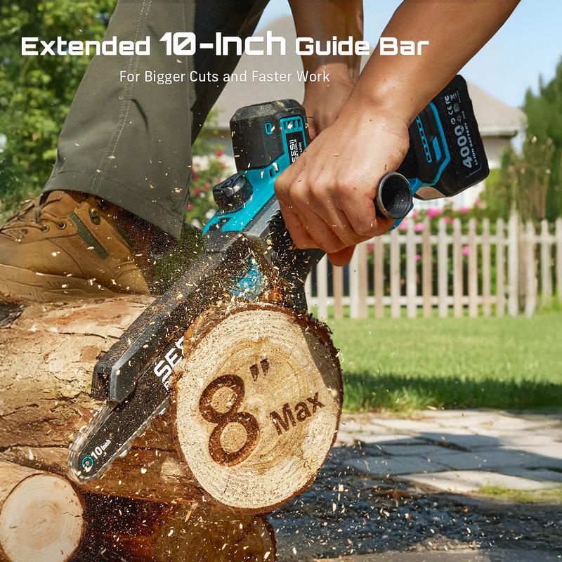10-INCH GUIDE BAR – STRONG POWER FOR FAST WOOD CUTTING: This 10-inch cordless chain saw delivers superior cutting power for thicker wood and branches. Designed for smooth, efficient trimming, it’s the best electric tree pruner for home use, orchard work, or yard maintenance