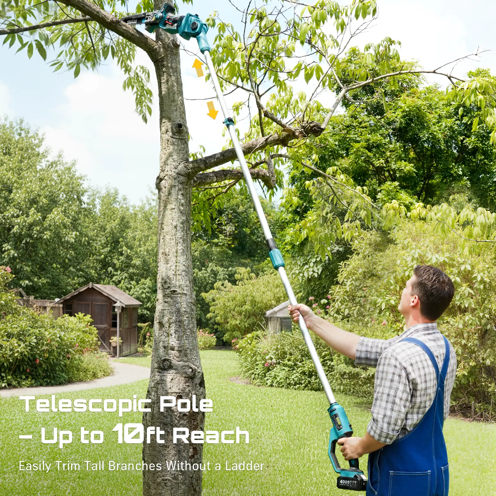 TELESCOPING POLE – EXTENDABLE REACH UP TO 10 FT: With a telescopic extension pole that reaches up to 10 feet, you can trim high limbs and trees safely from the ground. The adjustable cutting angle and direction give you full control when pruning hard-to-reach areas — no ladders needed