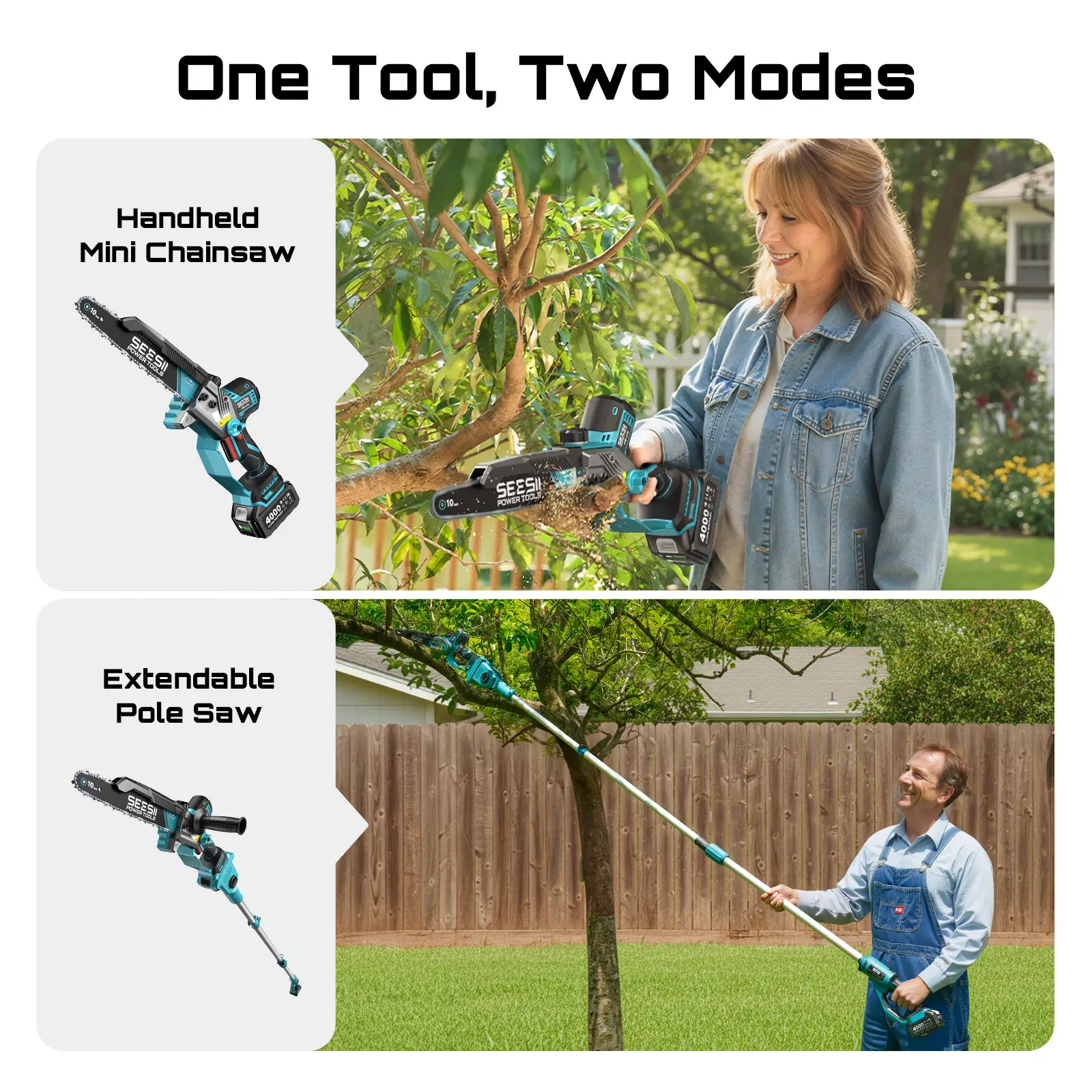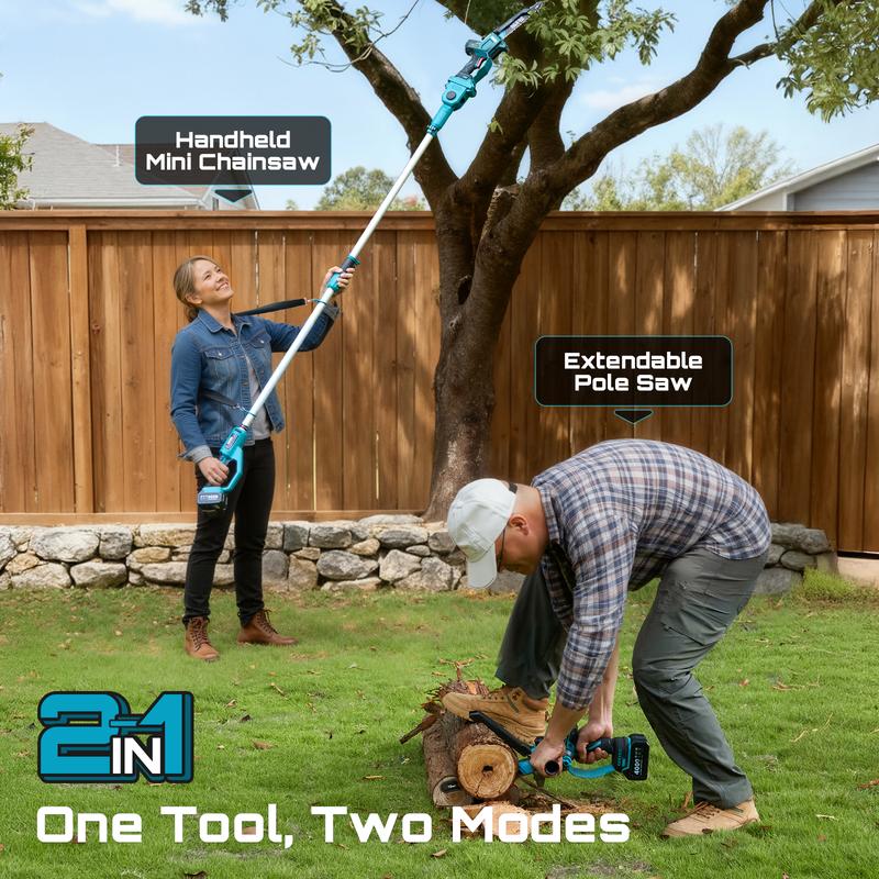 2-IN-1 CORDLESS COMBO – HANDHELD CHAINSAW & TELESCOPIC POLE SAW: The SEESII 2-in-1 electric pole saw and mini chainsaw combo lets you switch freely between a handheld trimmer and an extendable pole tool. Perfect for tree trimming, pruning thick branches, and cutting small limbs — a single cordless battery-powered saw kit for every outdoor task
