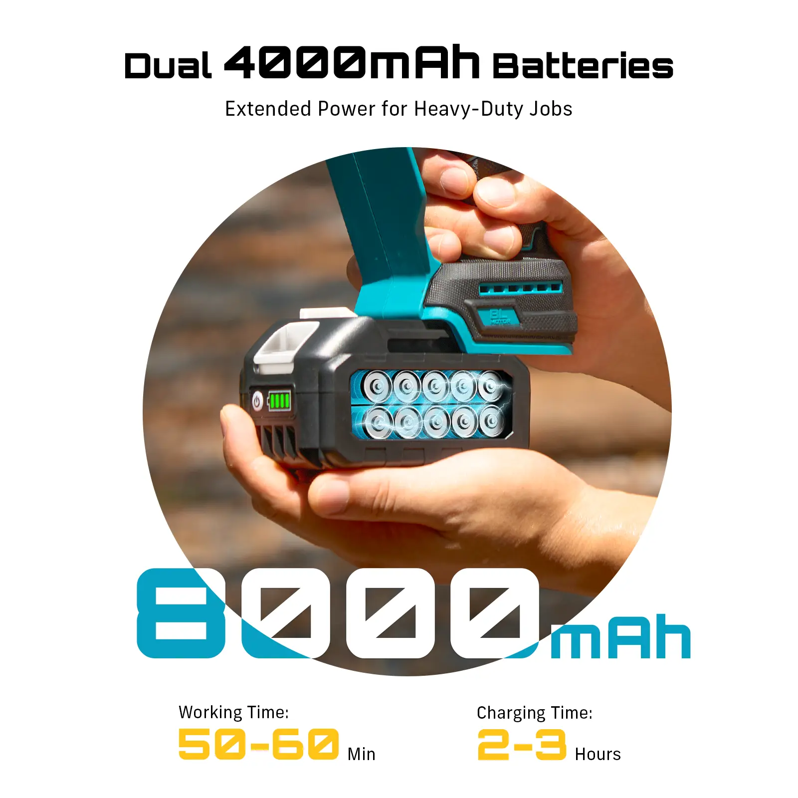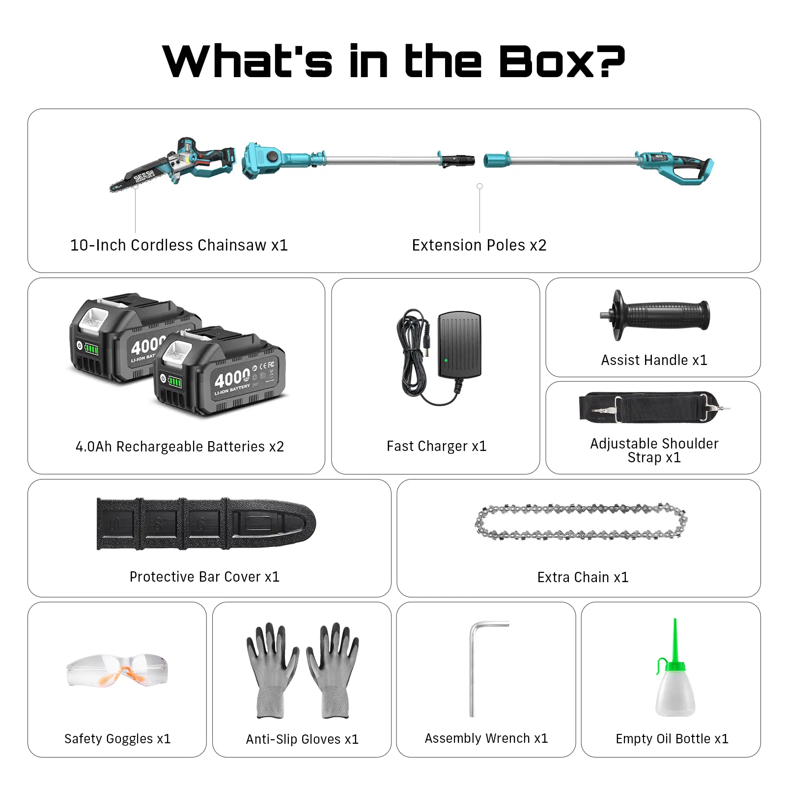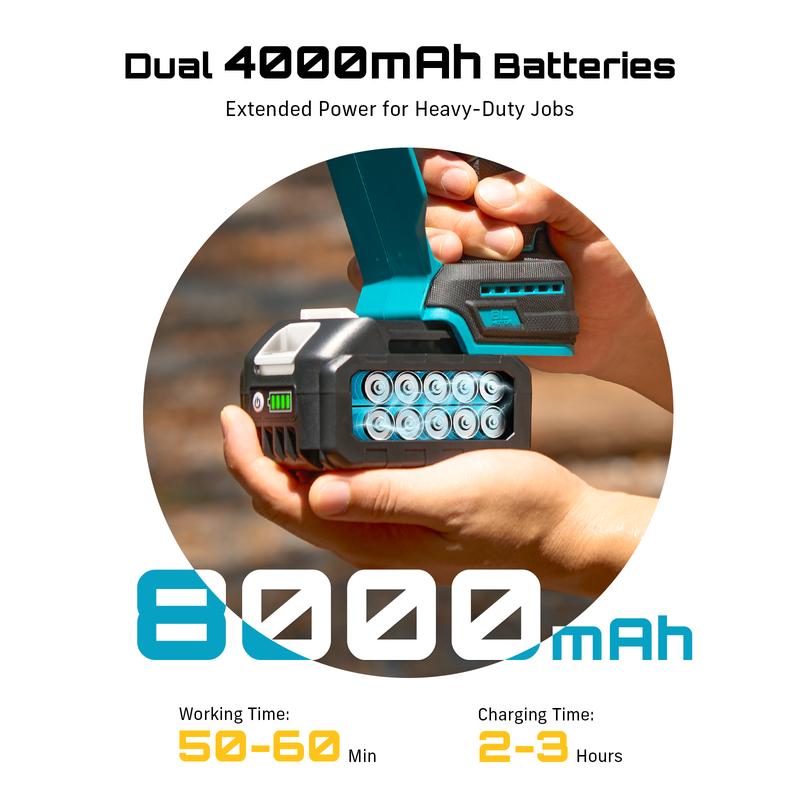 DUAL 4000mAh 21V BATTERIES – LONG-LASTING PERFORMANCE: Powered by two 21V 4000mAh batteries, this cordless pole saw offers extended cutting time for larger pruning or trimming jobs. Keep your electric saws running strong with a reliable charger included in the kit