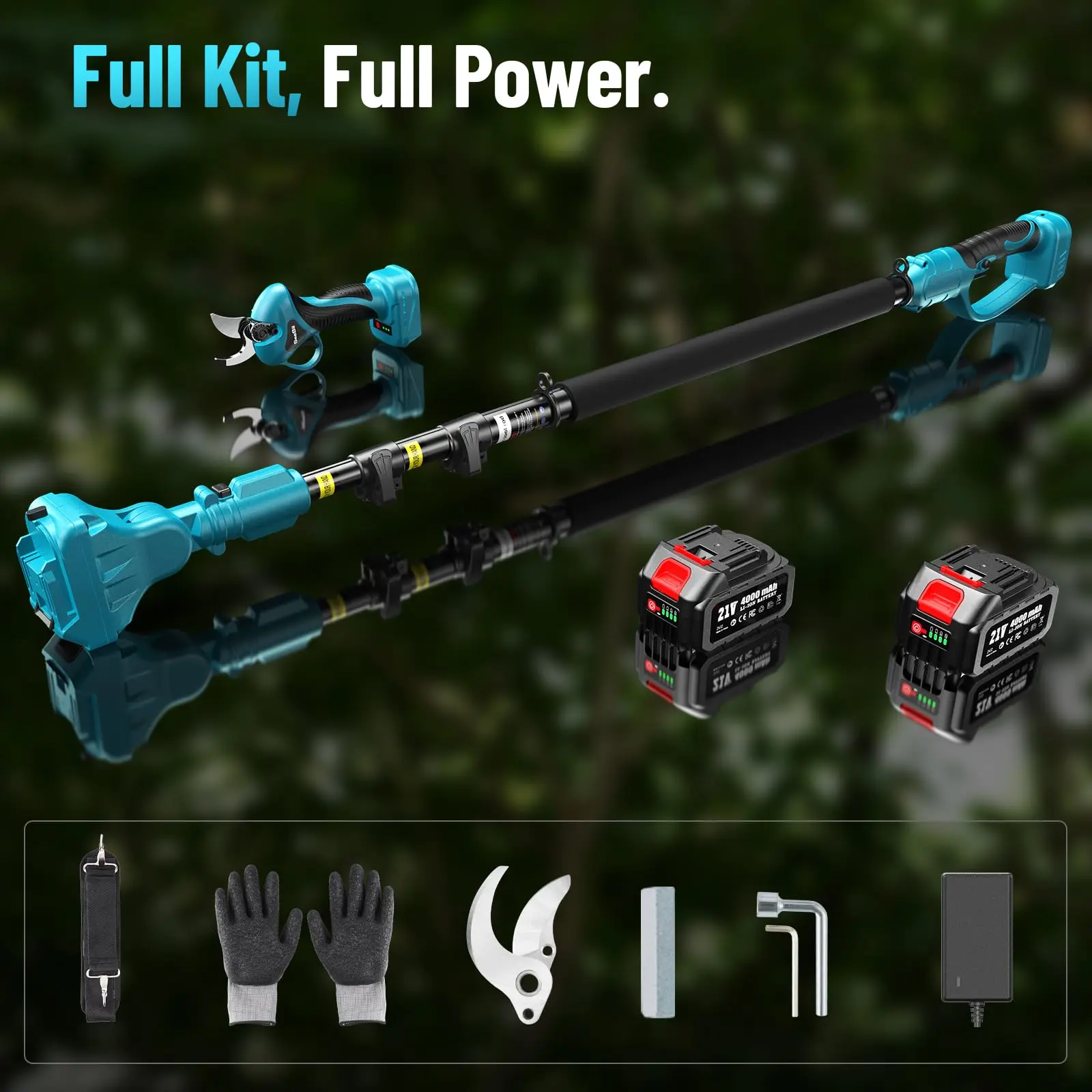 ·【2-in-1 Electric Pruner with Extended Reach】Switch between handheld and pole modes to trim branches at any height. Extends from 4.9 to 9 FT (up to 15 FT reach), allowing safe pruning of high branches from the ground—no ladder needed for faster, easier tree pruning