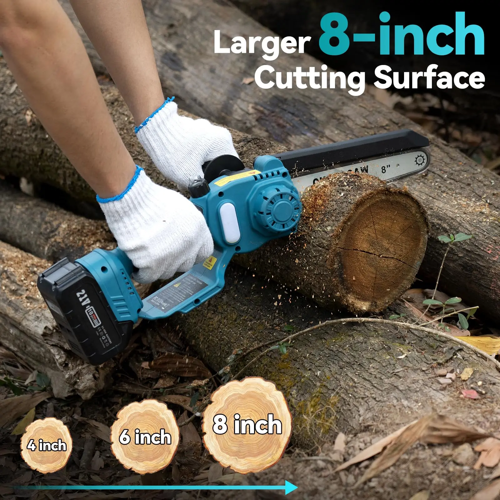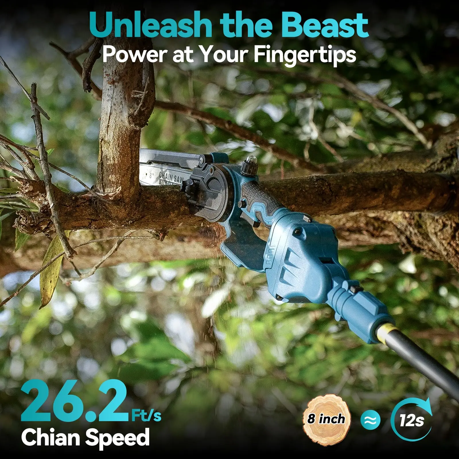 ·【6/8-inch Cutting Surface - Maximize Pruning Power】With its larger cutting surface, Seesii 6/8-inch small pole chainsaw offers approximately twice the cutting area of a 4-inch chainsaw and about 33% more cutting area than a 6-inch chainsaw. Seesii battery pole chainsaw takes your pruning abilities to new heights, effortlessly tackling thicker trees and branches. Upgrade to Seesii cordless mini pole saw and experience the satisfaction of efficient and precise cutting.