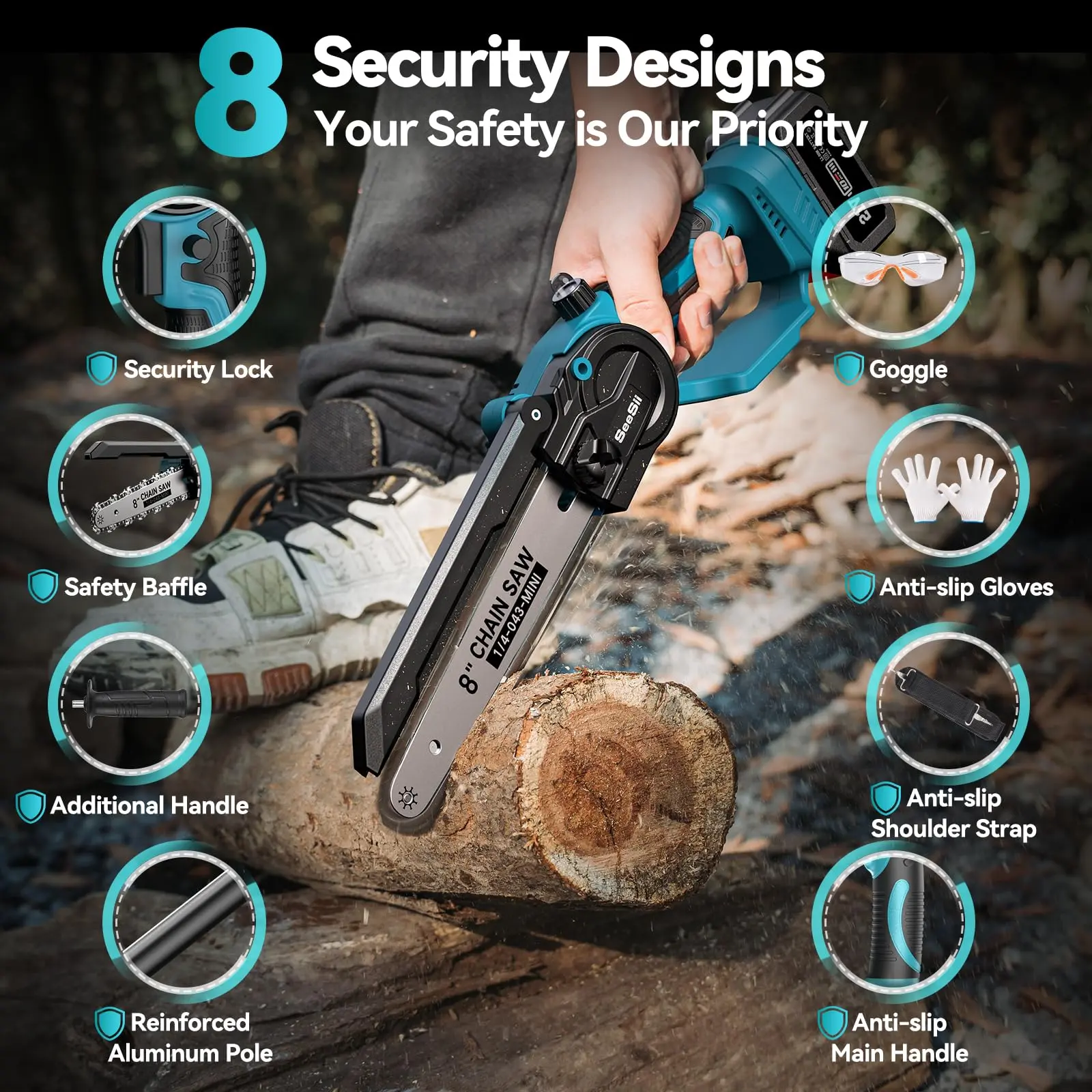 ·【8 Security Designs - Your Safety is Our Priority】Your safety is our top priority. Seesii super mini pole chainsaw is packed with seven essential security : (1) Security lock to prevent accidental activation; ( 2)Safety baffles to prevent the wood from splashing; (3) Additional handle for improved control and reduced fatigue, ensuring precise and safe cutting; (4) A reinforced aluminum pole to prevent excessive shaking during operation (5) Anti-slip main handle to grip the mini chainsaw tightly; (6) Anti-slip shoulder strap to prevent accidental slippage or pole mishaps; (7) Anti-slip gloves for a secure grip; (8) Goggle to protect your eyes from sawdust. Safety comes, use with confidence!