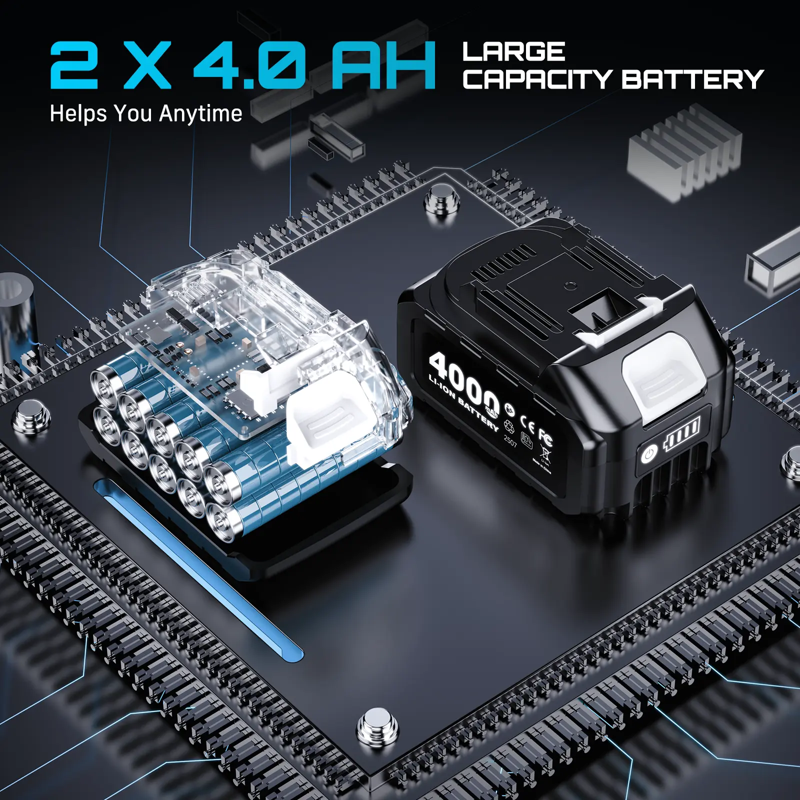 Long-Lasting Battery System: 2 x 21V 4.0Ah lithium-ion batteries, 200% longer runtime for non-stop work.