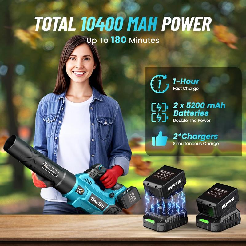 ¡Dual 5200 mAh Batteries for Extended Runtime: Seesii battery leaf blower, equipped with two 5.2Ah batteries and two chargers, ensuring long-lasting power for your outdoor cleaning tasks. The dual battery setup provides up to 180 minutes of runtime on low settings, ideal for clearing large areas, driveways, and patios without frequent recharging. Its extended runtime lets you clean large spaces without interruptions, keeping your yard tidy for longer