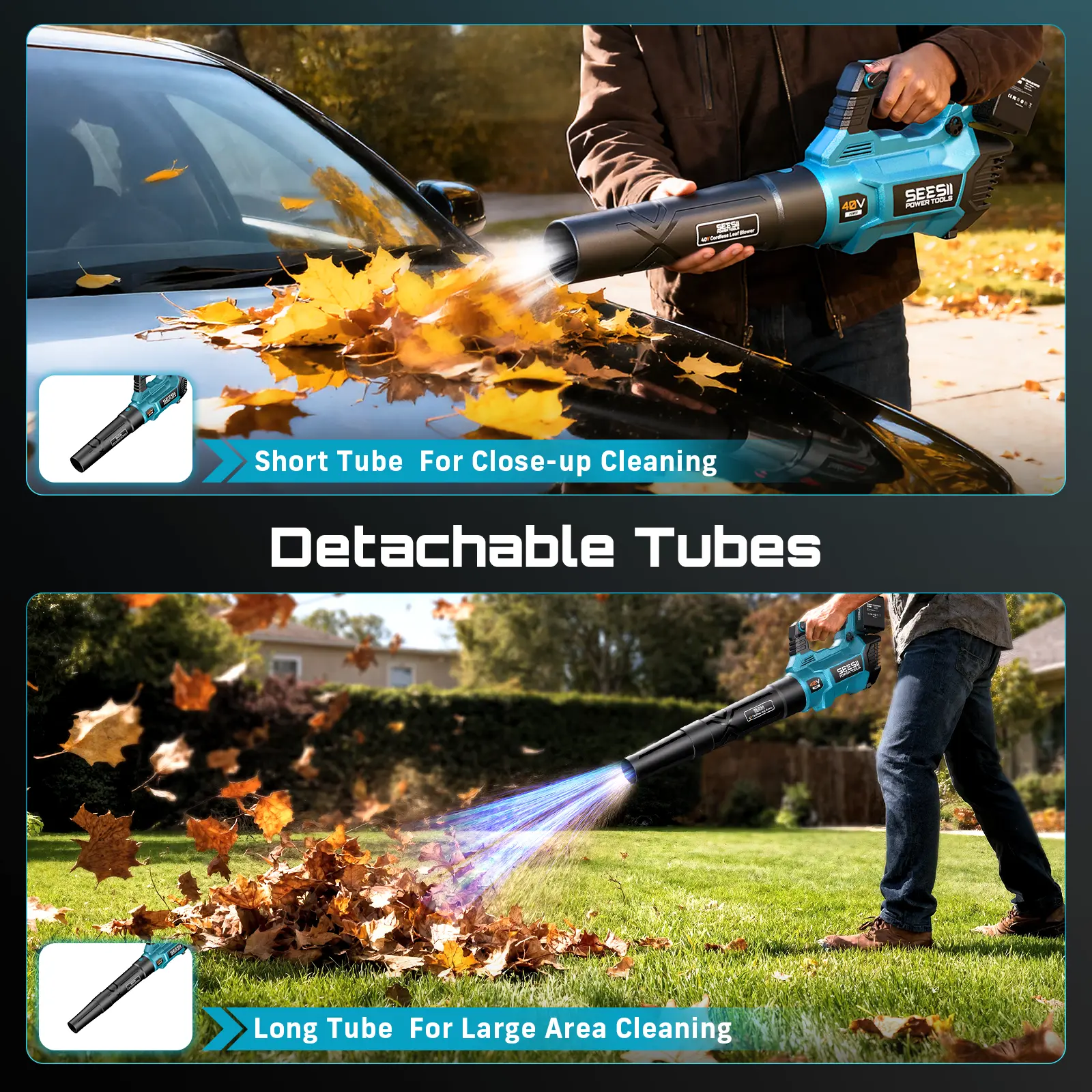 ¡Two Nozzles for Versatile Cleaning: Seesii high power blower comes equipped with two nozzlesâa long one for extended reach and a short one for concentrated power. The long nozzle is perfect for tackling large areas like driveways, lawns, and patios, allowing you to clear debris from a distance with ease. Meanwhile, the short nozzle provides focused airflow for more precise tasks, such as cleaning tight spaces or removing stubborn debris from corners