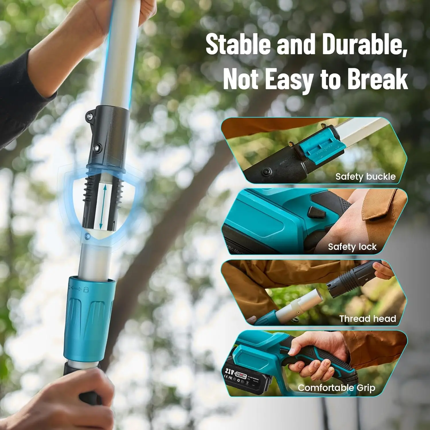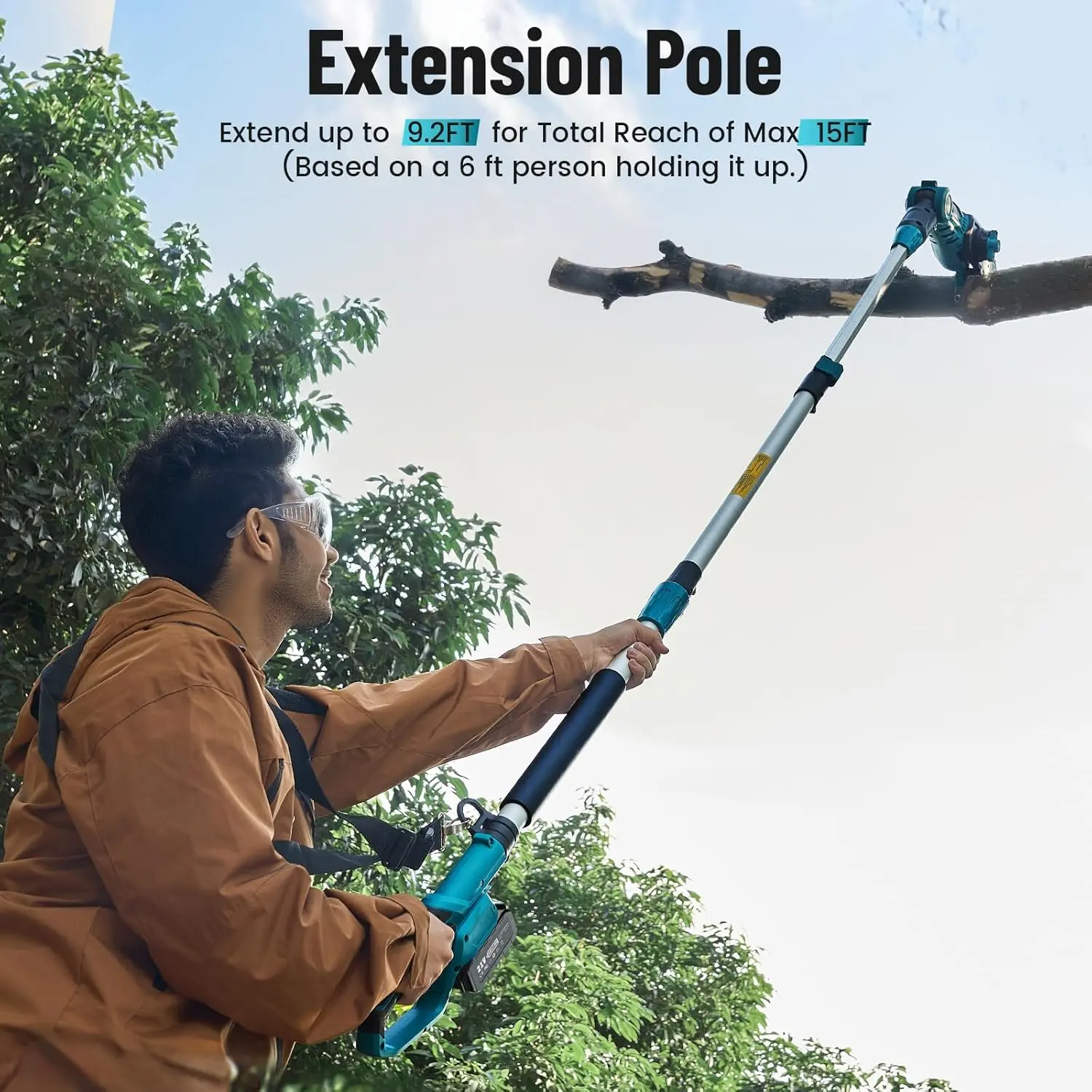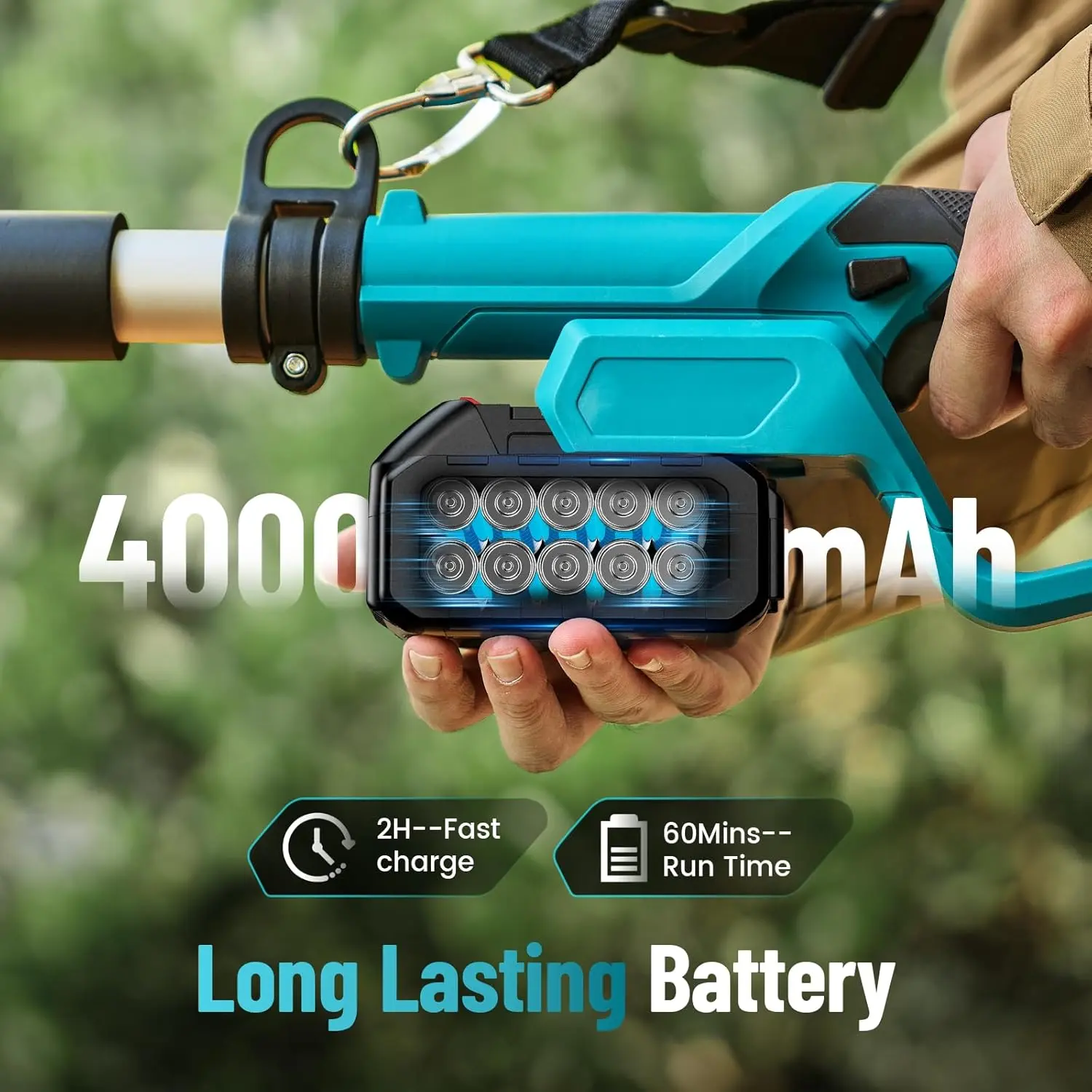 ·Longer Battery Life for More Work Time: Equipped with a powerful 4000mAh battery, this battery powered pole saw runs longer than most on the market. The included charger is safe and quick, fully recharging in just 2 hours and delivering up to 1 hour of continuous operation—perfect for all-day use without interruptions