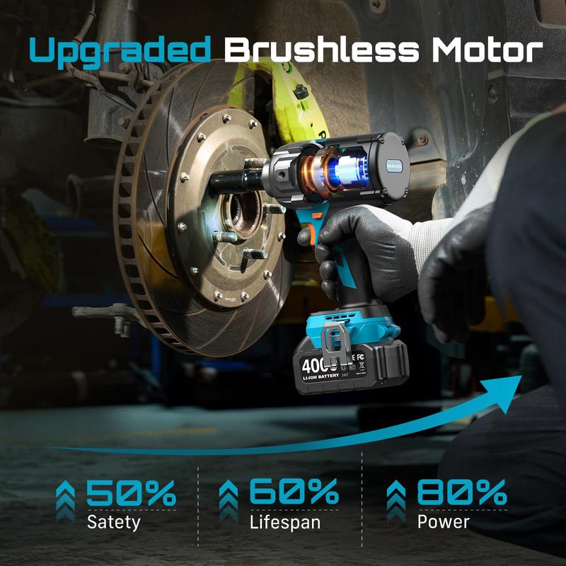 Delivers 50% more power/runtime than brushed motors; quieter, spark-free, and longer-lasting. Reaches 1180 ft-lbs (1600N·m) torque to tackle rusted bolts.