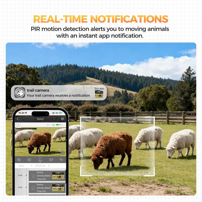 ·Smart Detection & Real-Time Notification: Advanced PIR smart sensors detect both animals and people, sending real-time notifications to your phone. Video can be viewed anytime using a memory card (up to 128 GB) or cloud service (free trial for 1 month).
