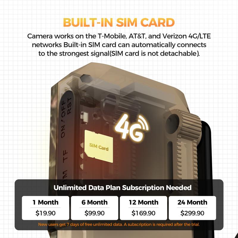·4G No Wi-Fi Cellular Trail Cameras: Operates wherever there is a 4G signal, supporting Verizon, T-Mobile, and AT&T. Includes a SIM card with 300 MB of free data, no activation required.
