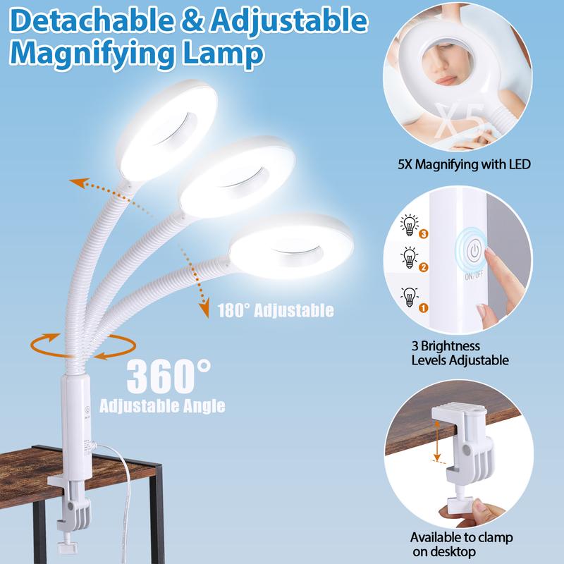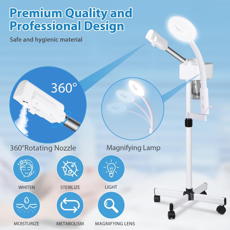 Hot steam from the device opens up pores, allowing for effective facial cleansing. Consistent use can contribute to skin hydration, diminish wrinkles, and reduce uneven skin tone. Additionally, the steamer stimulates blood circulation, helping to oxygenate the skin for a healthier, more vibrant complexion.Professional ‘Facial Steam’ + 2-in-1 ‘Magnifier Lamp