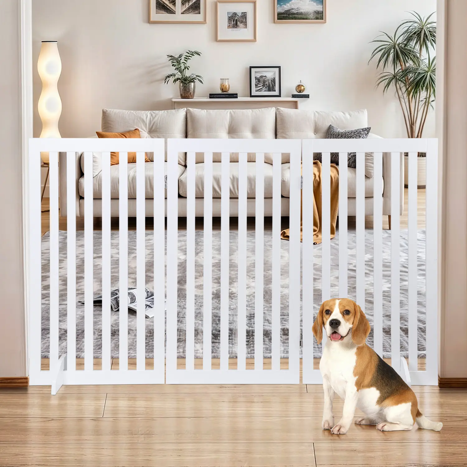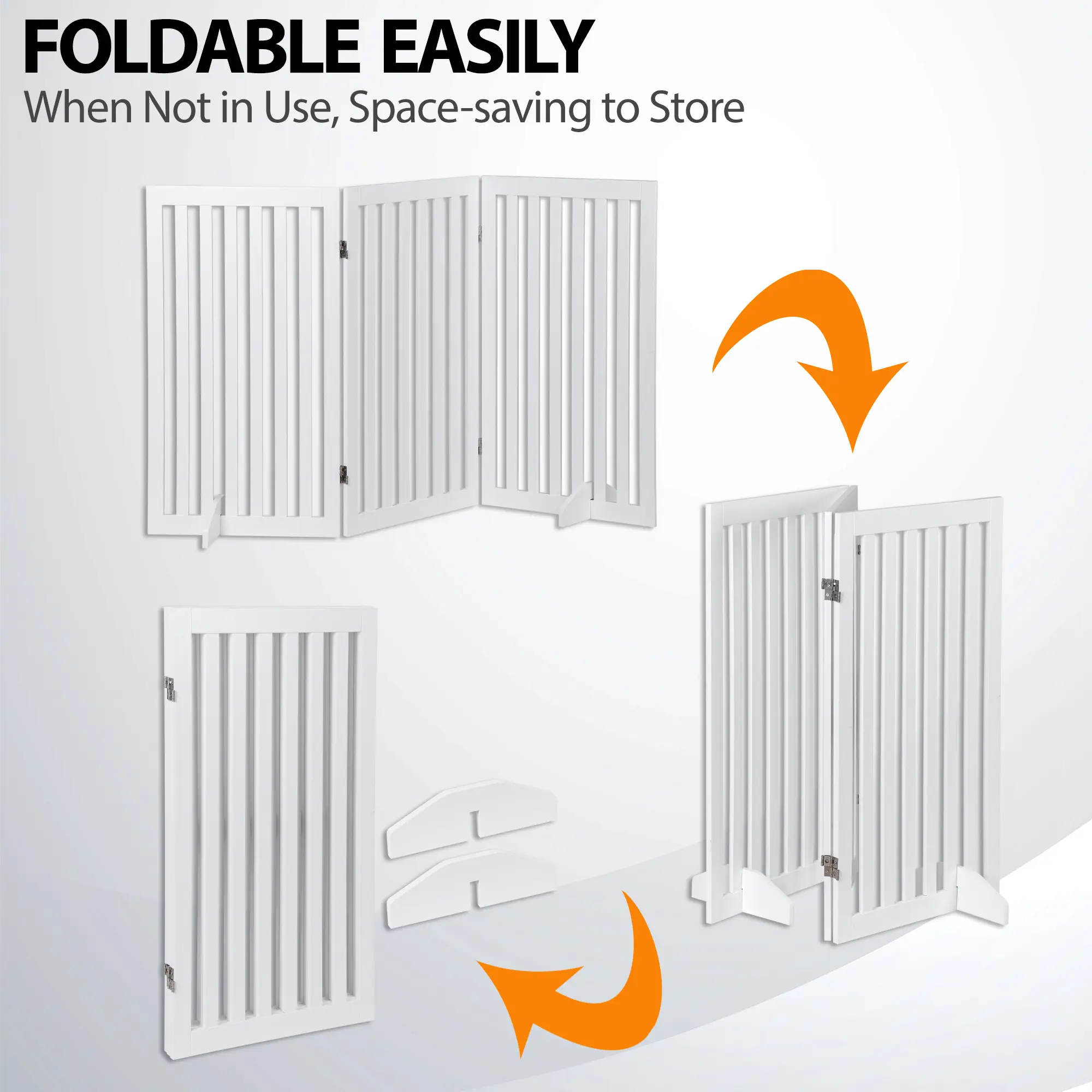3-Panel Z-Shape Design: Featuring three sturdy panels connected by durable hinges, the gate can be folded into a wide Z-shape configuration. Once unfolded, it stands freely and can be placed in front of doorways, hallways, bedrooms, staircases, or entryways.
