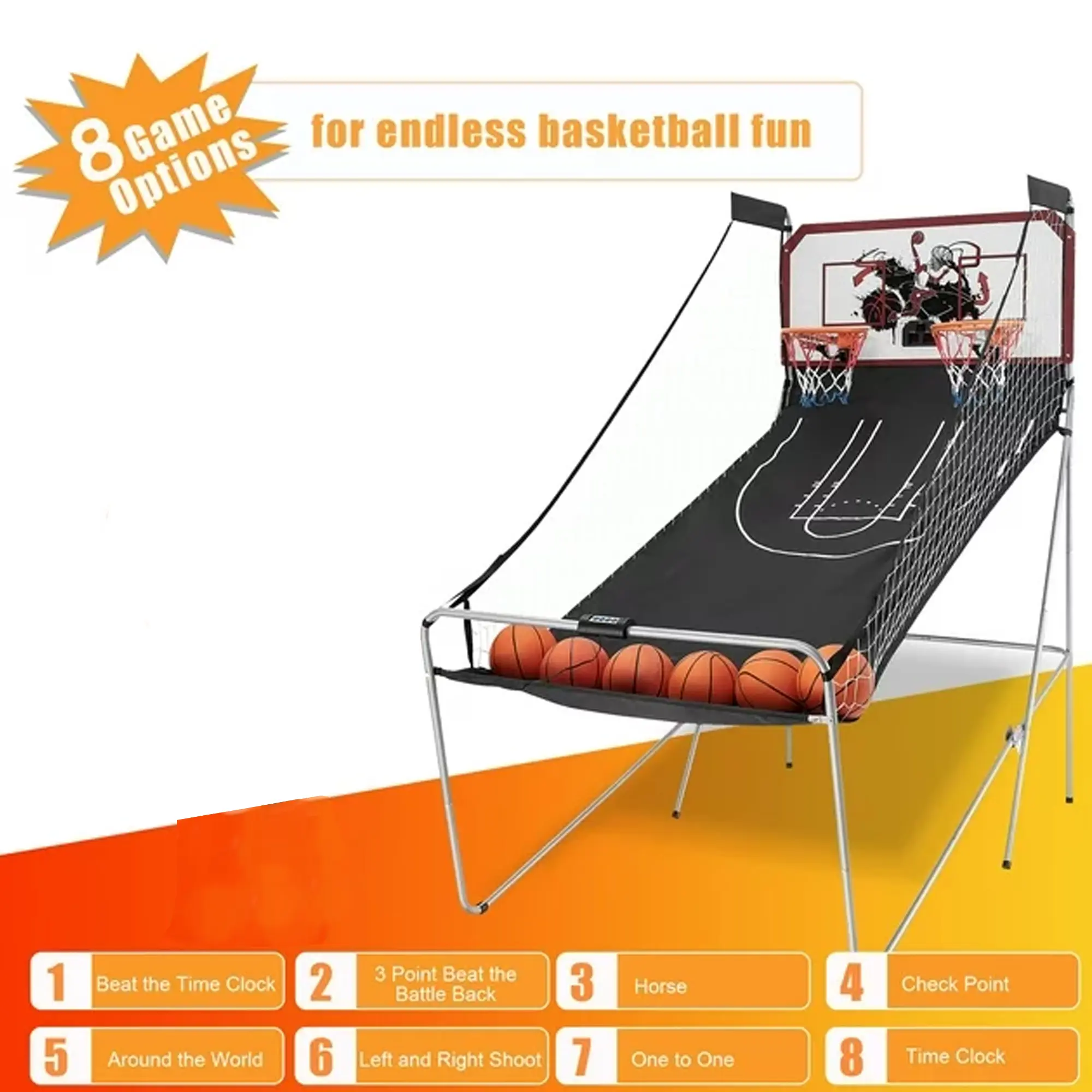 ItemDetailsPlayers1–2 playersGame Modes8Power3 × AA Batteries (not included)Unfolded Size81" × 44" × 81"Folded Size44" × 32" × 81"FramePowder-coated steelBackboardMDFRamp420D Oxford clothBasketballsSix 7" rubber ballsIncludesLED scorer, pump w/ needle, hardware, manual
