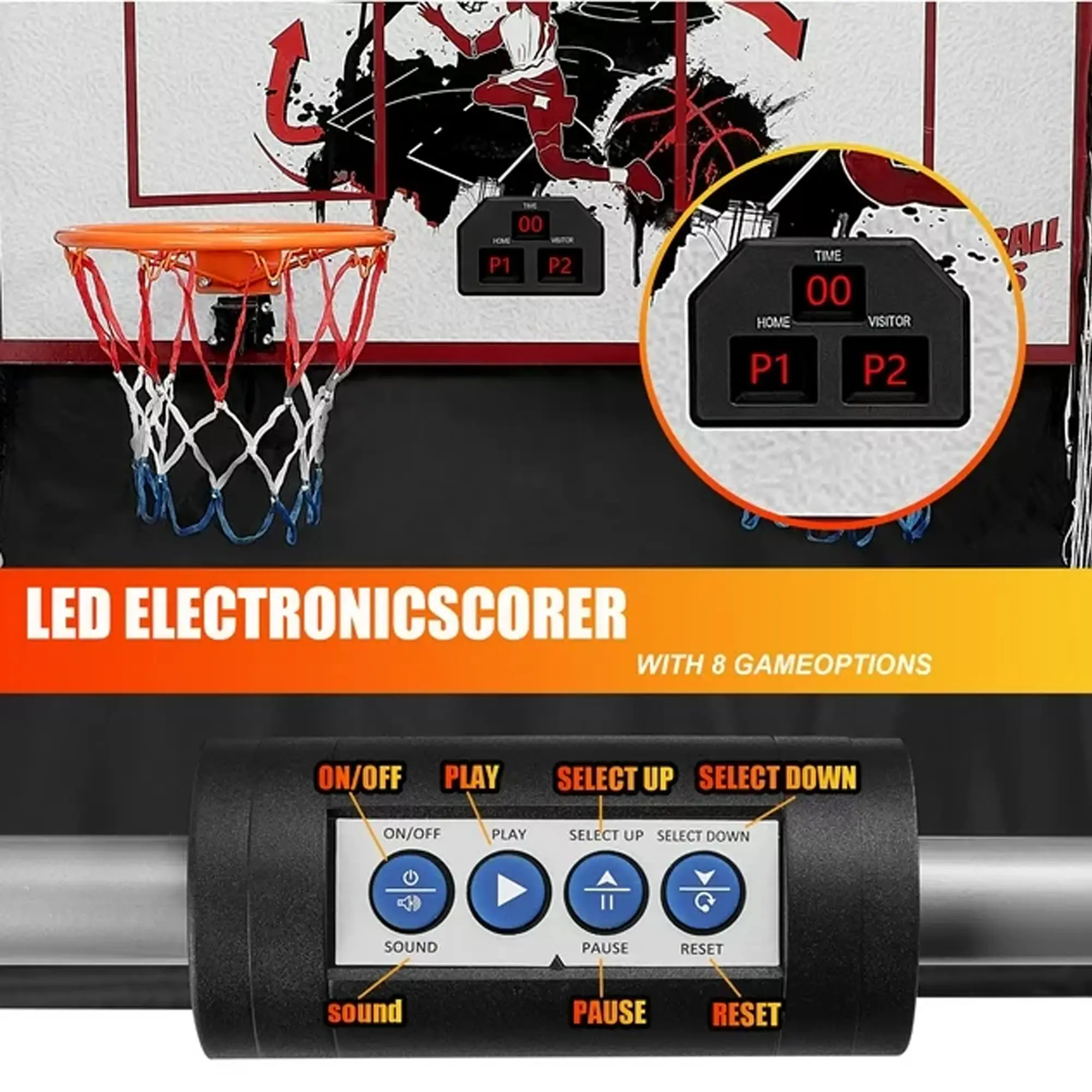 Includes an LED electronic scoreboard, 6 rubber balls, and a pump with needle—everything you need for rapid-fire hoop battles.