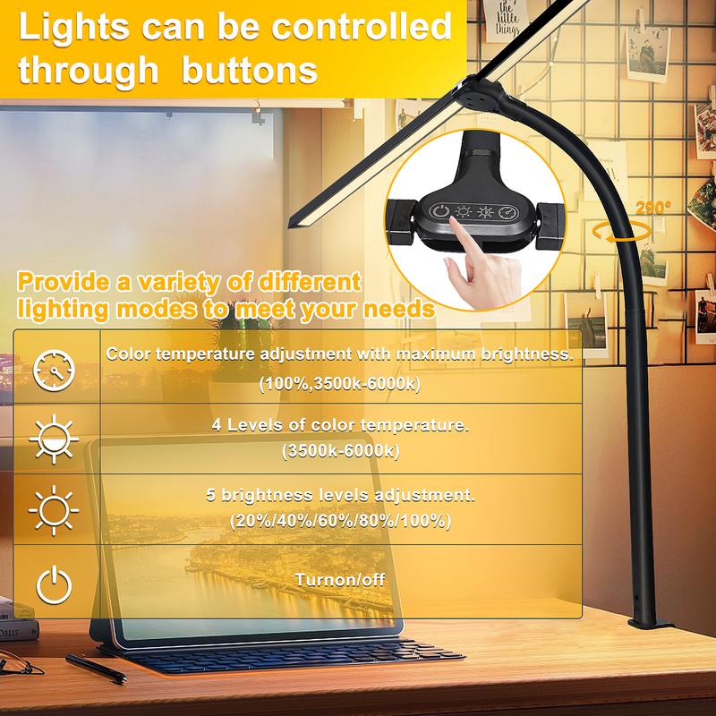 ·Adjustable Swing Arm Lamp: Double head design + Gooseneck design,Super flexible swing arm desk lamp allows you to position the light in any direction you need. It has 2 light bars that are 180° rotatable and a clamp base that can rotate 290°. You can effortlessly point the light to the desired location to create ambient lighting.