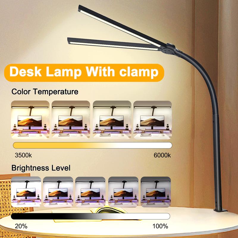 Segrass Double Head LED Desk Lamp for Office - Eye Caring Lamp with Clamp, Flexible Adjustable Lighting Gooseneck Desk Light, 4 Color Modes & 5 Brightness Levels for Monitor Workbench Study Reading
