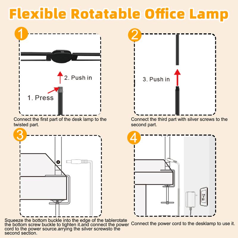 ·Touch Controls & Memory Function:The Brightness and color temperature of the LED table desk lamps are easily adjustable with the frontal touch sensitive buttons.5 brightness levels (20%-100%) + 4 color temps (cozy 3000K to crisp 6000K) adapt to every mood and task. Desk light with memory function can keep the mode and brightness last used. After installing it with a metal mounting clip, connect the power supply and then click on the touch switch.