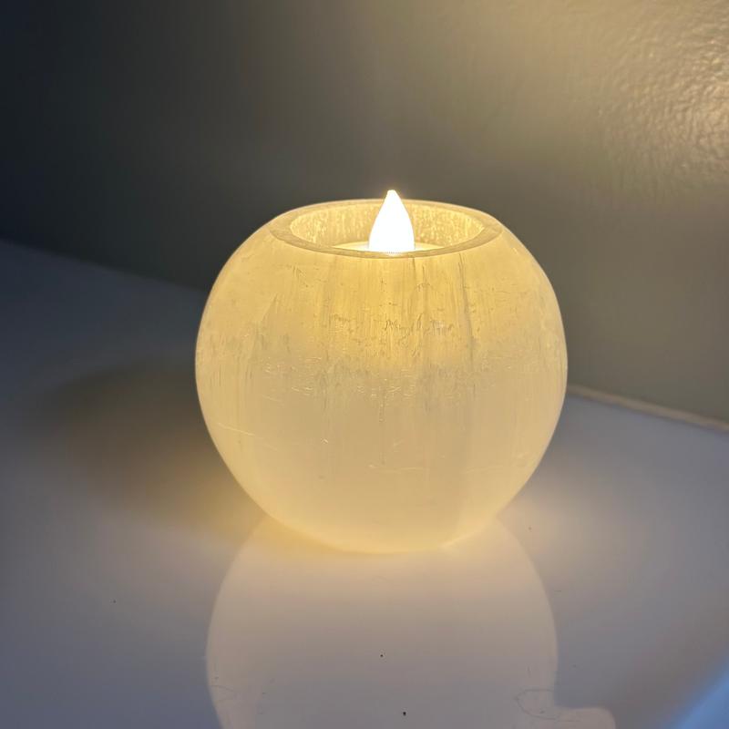 This listing is for a single Selenite Tealight Holder. This Selenite is polished into a round shape and holds a single tealight candle.