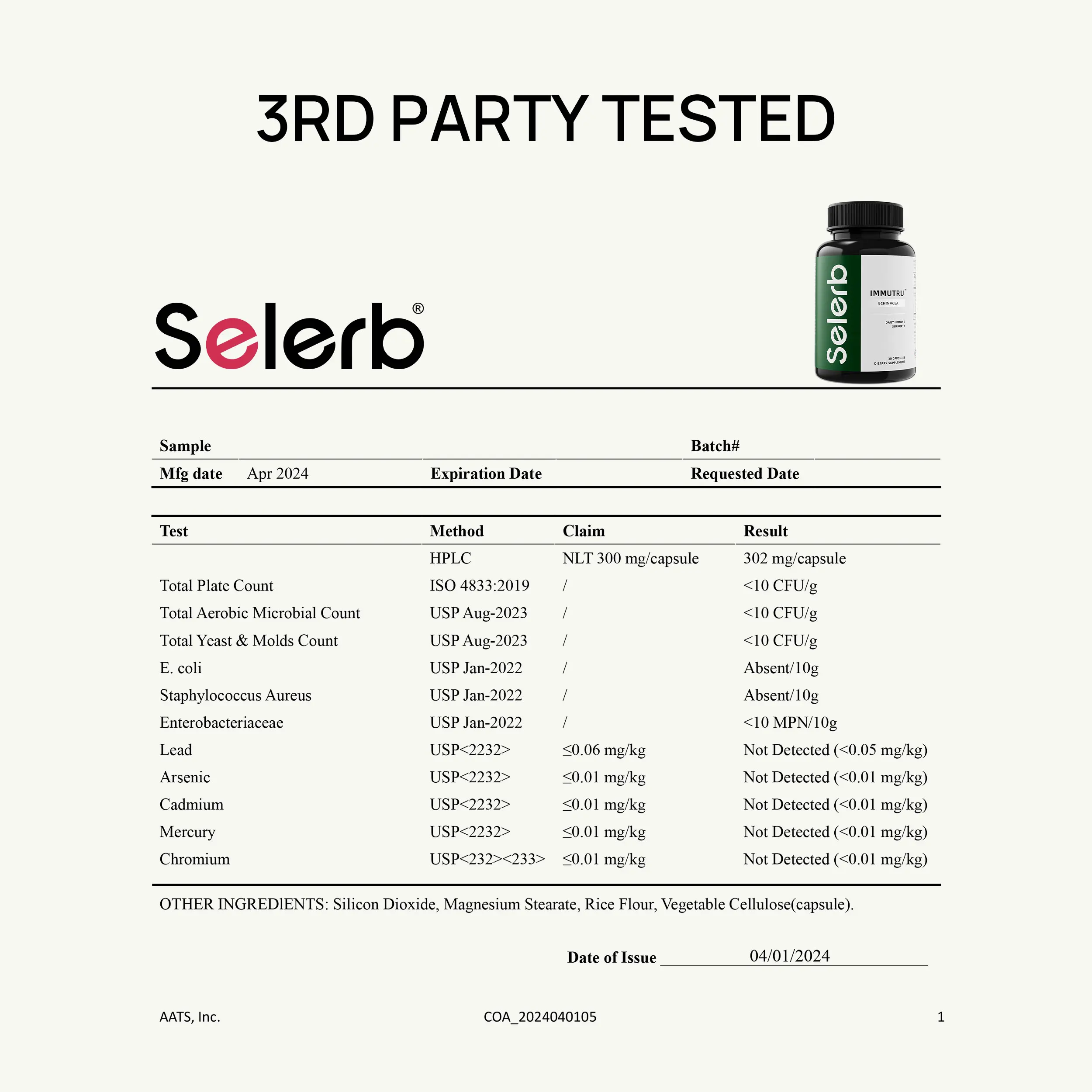 ·GMO-Free: Made with non-GMO ingredients, Selerb Immune is free from soy, dairy, gluten, and tree nuts, ensuring quality and safety.