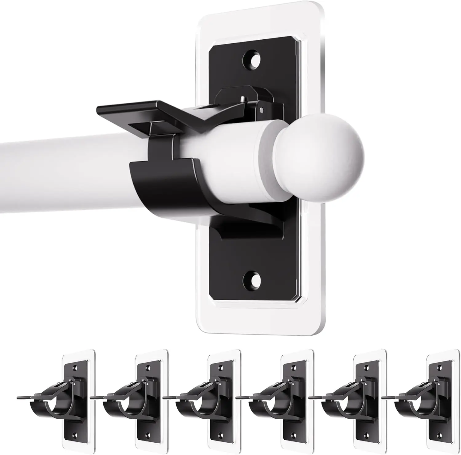 ·【Pack of 6 & Hold up to 20 Lbs 】- No Drill Curtain Rod Brackets made from the latest nano acrylic-gel pads and black PC plastic, no rust, no turn yellow, no deformed. Incredibly adhesion sturdy enough to hold up 20 lbs. Just peel off the back film and stick it on. For the weight more than 20 lbs rod, multiple adhesive bracket hooks can help distribute the weight of the rod. You will get 6 packs no drill curtain brackets holders