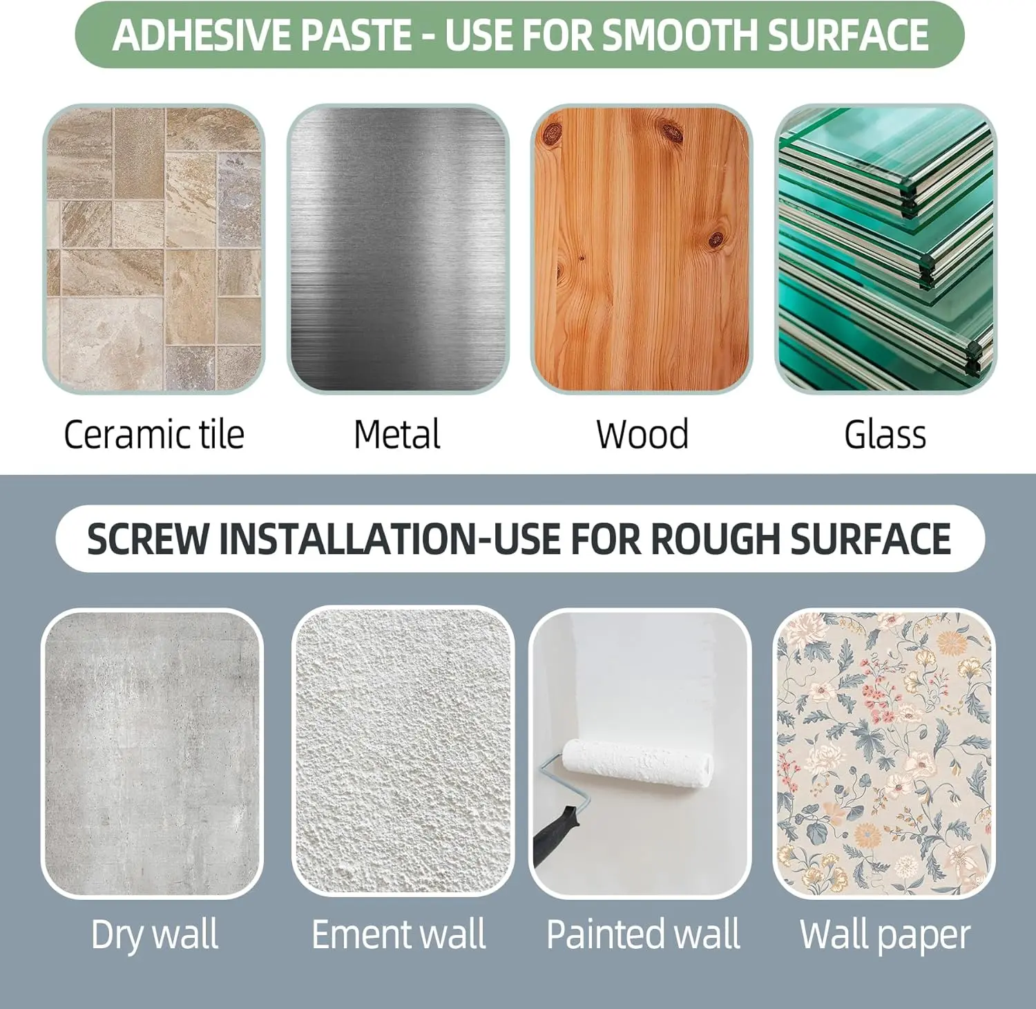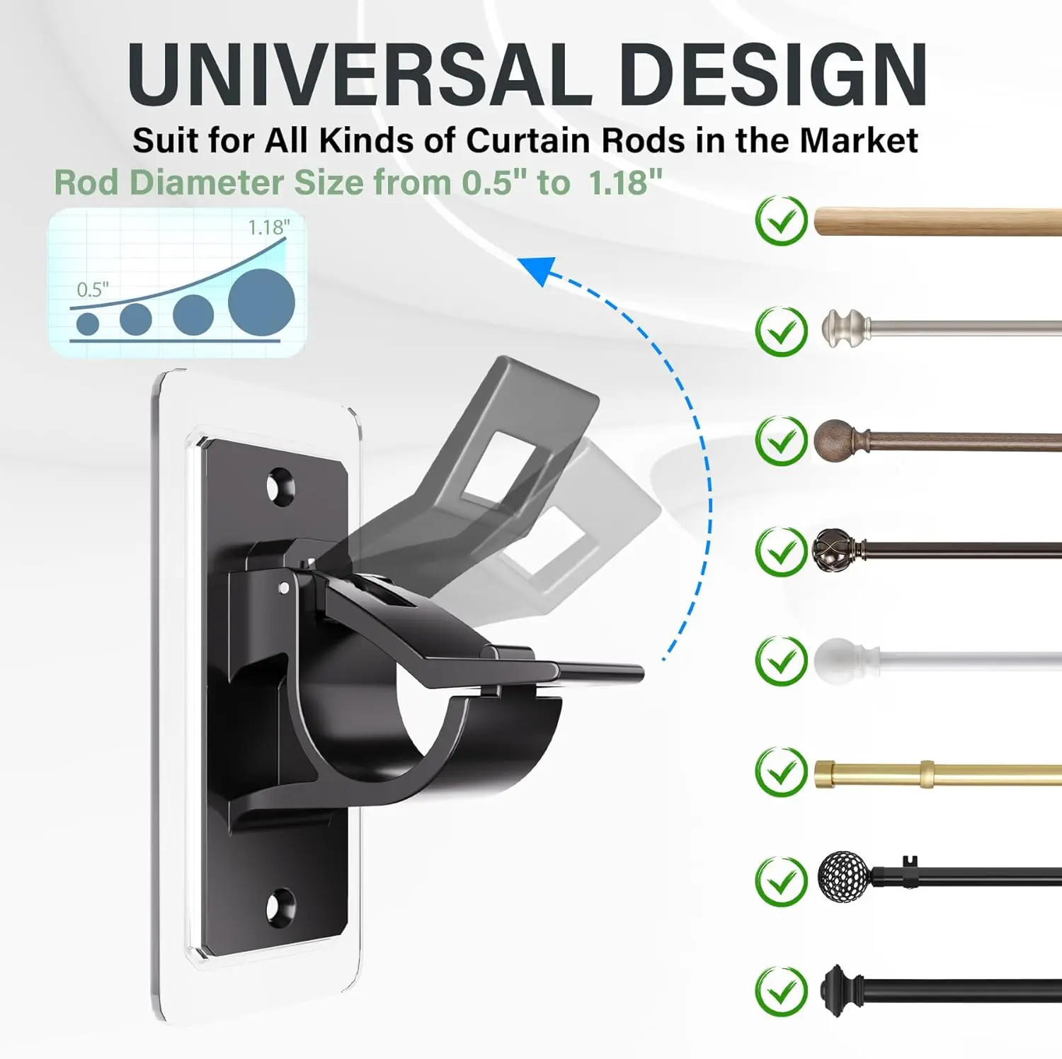·No Wall Damage and Suitable for most curtain rods or towel rods with Diameter ranging from 0.5'' to 1.18''. KIND TIPS: Pay attention to checking the wall. The aging wall itself cannot bear the weight of the curtains, and the sticky hooks are very sticky and may fall off along with the wall powder