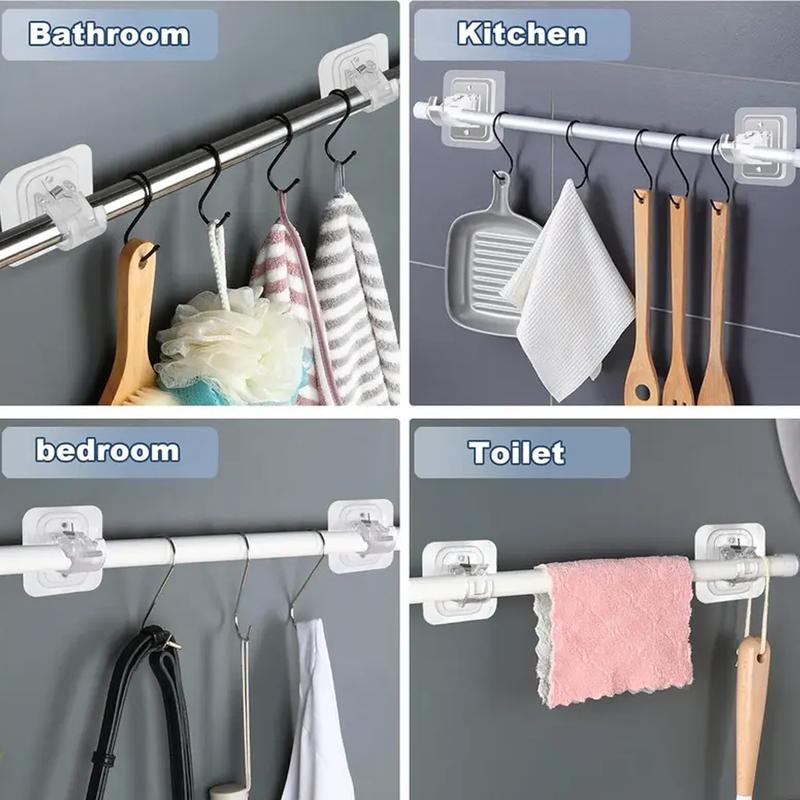 The nail-free adjustable rod bracket hook is very easy touse. You just need to press the pole into the bracket andfix it in the plastic clip. lt can be easily disassembledwhen no longer needed, without causing wall damage. ltis waterproof and oil-proof. (Suitable for 1.5-2cm/0.78inch pole and rod)