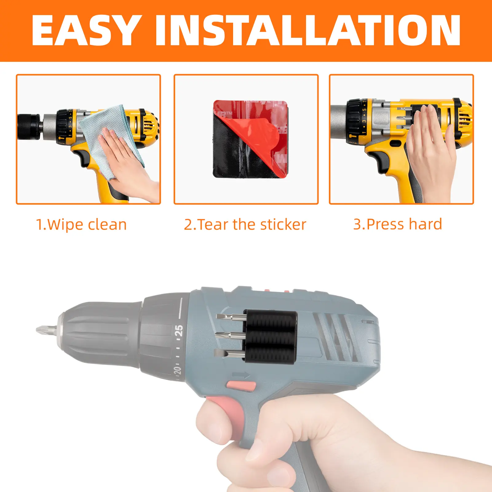 Adopting a nano-adhesive process, these holders offer stronger adhesion. After thousands of high-strength tests, they won't fall off even during intense work. The bits are stored away from your hand, ensuring seamless fitting.