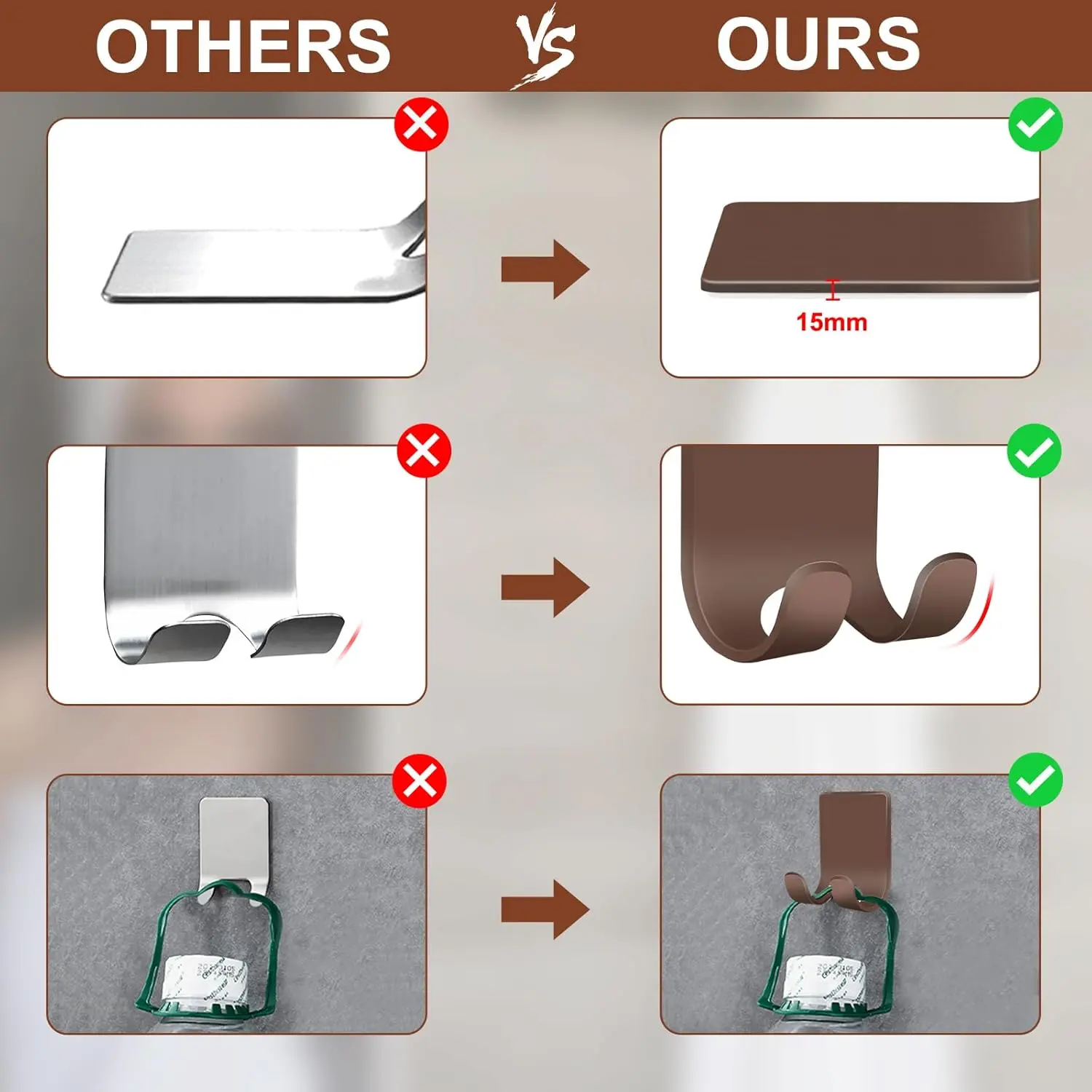 【Suitable Wall Surface】Make Sure The Wall Is Clean, Dry And Smooth, This adhesive hooks only works smooth clean dry flat and non-porous surface, such as glass, window, mirror, porcelain tile, glazed tile, , stainless steel, plastic surface etc. Doesn’t work curved surfaces such as PAINTED WALL, CERAMIC, , Marble, Granite, Mosaic Plastered Wall, Lime Wall, Wallpaper, Frosted Glass, over Grout Lines etc