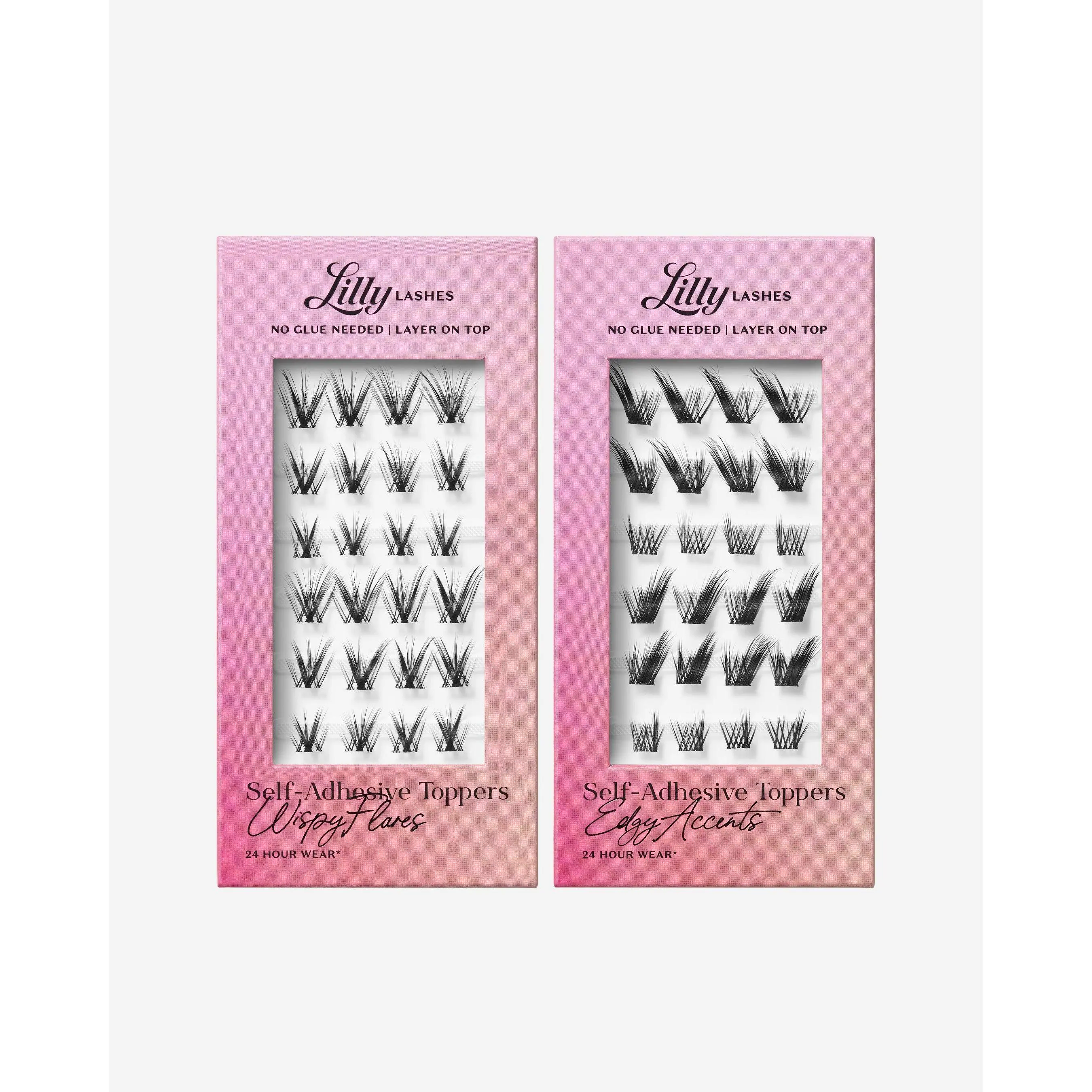 Double the drama, zero glue. Take your lash look to the next level with our Self-Adhesive Toppers Bundle, featuring both styles: EdgyAccents and WispyFlares. These lash toppers are designed to layer over your natural lashes or elevate your favorite Lilly Lash.