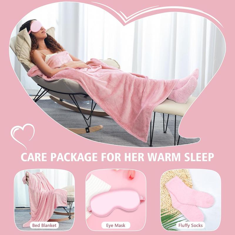 ·【BLANKET + SOCKS + EYE MASK FOR HER COSY SLEEP】The soft, durable blanket and socks are machine-washable and dryer-safe, resisting fading and fiber shedding. The 39"x59" flannel blanket is perfectly sized for her restful sleep in bed or relaxing moments on the couch. Wrapped in the soft blanket, with soothing coral fleece socks and an eye mask, she'll drift into a warm, comfortable sleep by your care and love.
