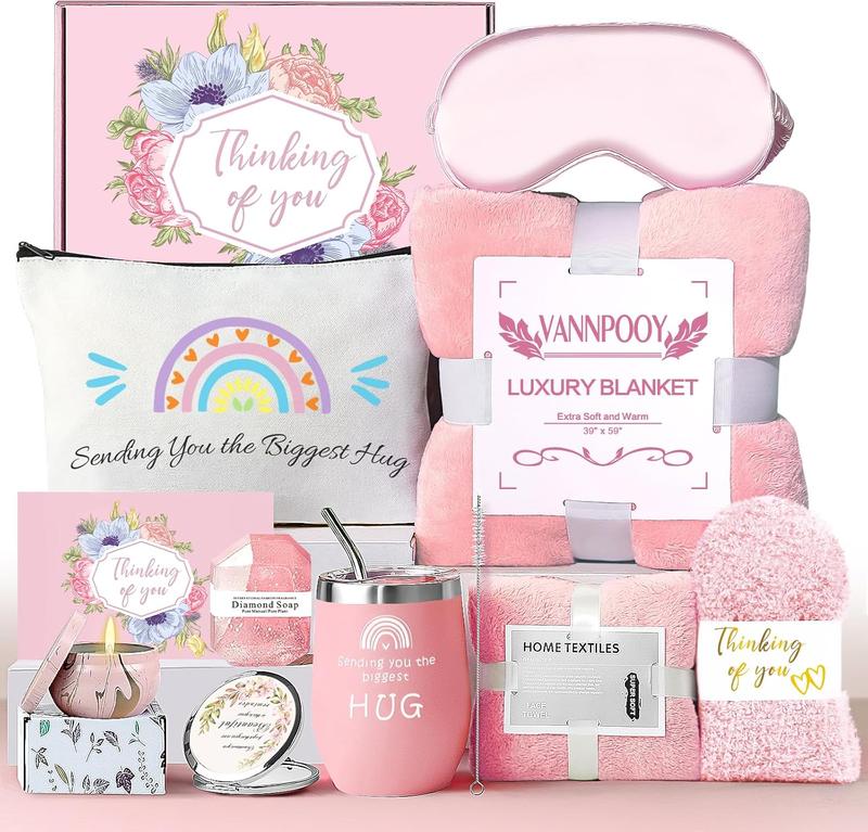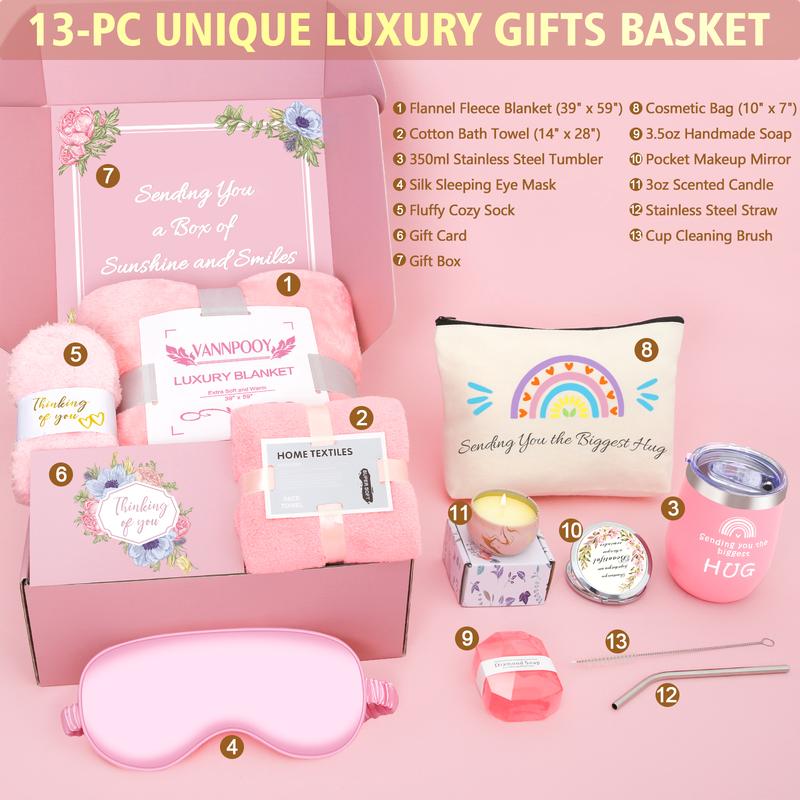 ·【WHAT ARE INCLUDED IN OUR LUXURY GIFTS BASKET】Our gifts set for women features (1)blanket, (2)socks, (3)towel, (4)tumbler, (5)straw, (6)brush, (7)eye mask, (8)candle, (9)soap, (10)makeup bag, (11)mirror, (12)greeting card, (13)gift box. They are packaged attractively for gifting in lavender theme. You may write personal messages on the lovely greeting card to make it a special get well gifts for her.