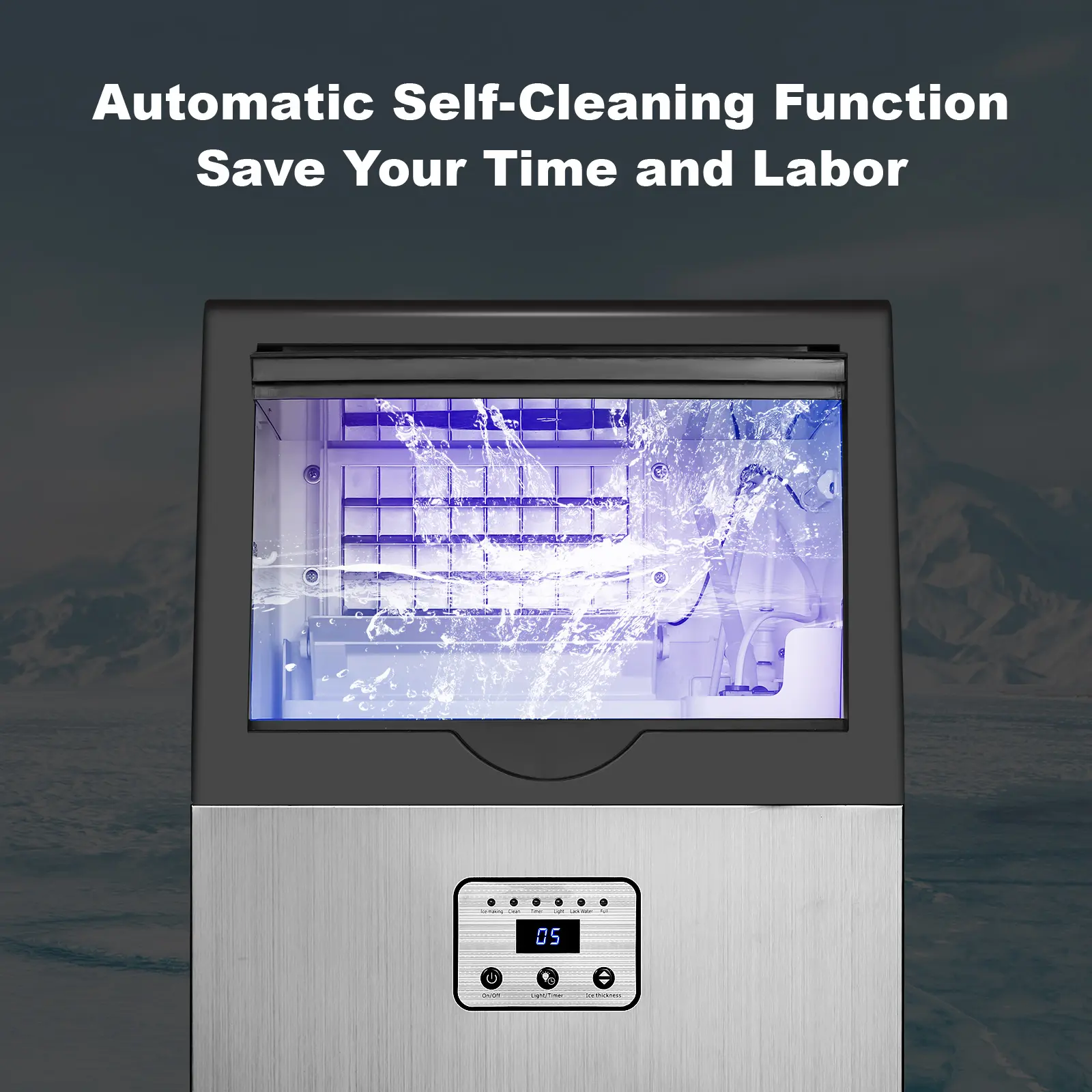 Multi-function control panel: The ice machine is equipped with a smart LCD panel. Any function and any operation can be resolved in the control panel. The panel displays the temperature of the environment and reminds you to pay attention to the temperature of the surrounding environment to ensure the efficiency of ice making. You can adjust the size of the ice cubes by adjusting the ice making time. When you press the clean button, the industrial ice machine will automatically clean.