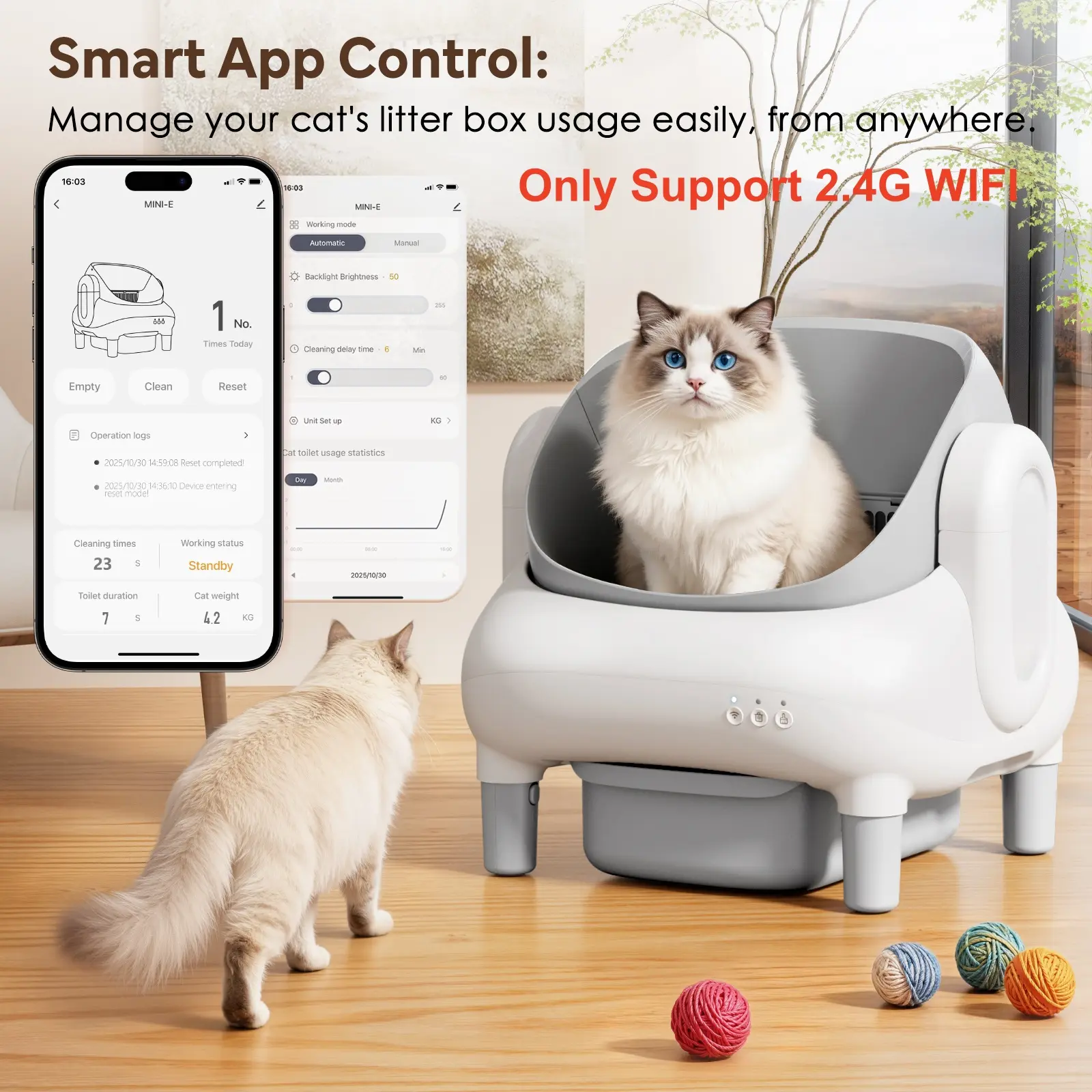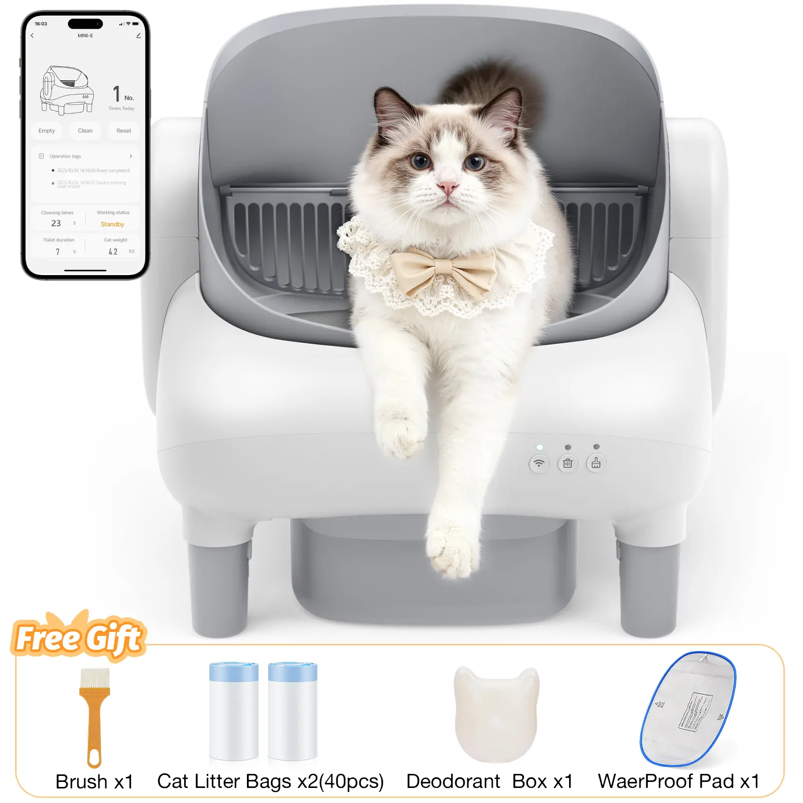 Smart APP Control- Remote Management: Activate auto-cleaning, schedule waste disposal, and track litter usage trends- Instant Alerts: Receive alerts for full bins- WiFi Compatibility: 2.4G WiFi for stable connectivity