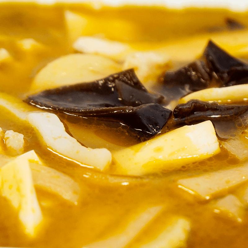 ·Delicious sweet potato noodles and flavorful vegetables in a rich golden broth