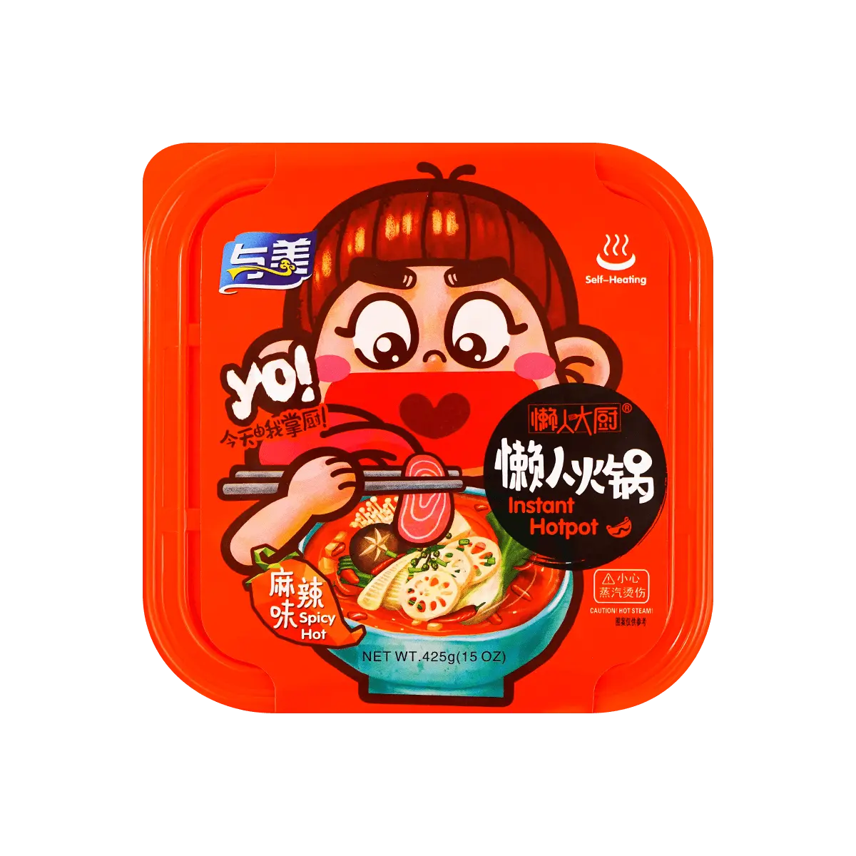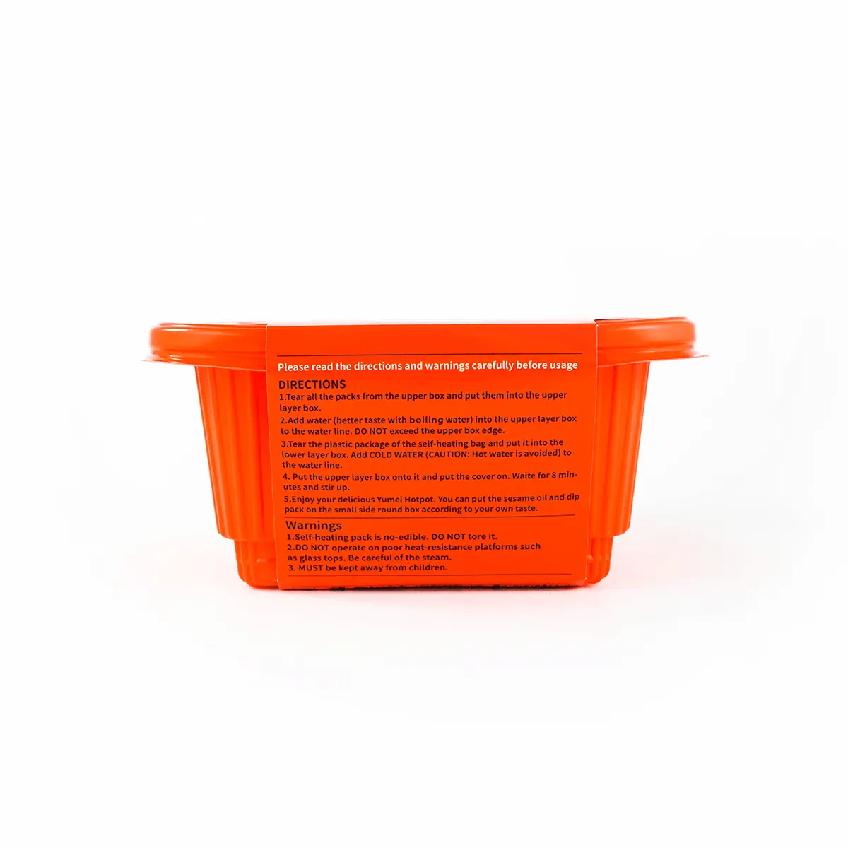 ·1. Tear all the packs from the upper box and put them into the upper layer box. 2. Add water (tastes better with boiling water) into the upper layer box to the water line. DO NOT exceed the upper box edge. 3. Tear the plastic package of the self-heating bag and put it into the lower layer box. Add COLD WATER (CAUTION: Avoid hot water) to the water line. 4. Put the upper layer box onto it and put the cover on. Wait for 8 minutes and stir. 5. Enjoy your delicious Yumei Hot Pot. You can put the sesame oil and dip pack on the small side round box according to your own taste. WARNINGS 1, The self-heating pack is not edible. DO NOT tear it. 2. DO NOT operate on surfaces with poor heat resistance, such as glass tops. Be careful of steam. 3. MUST be kept away from children.