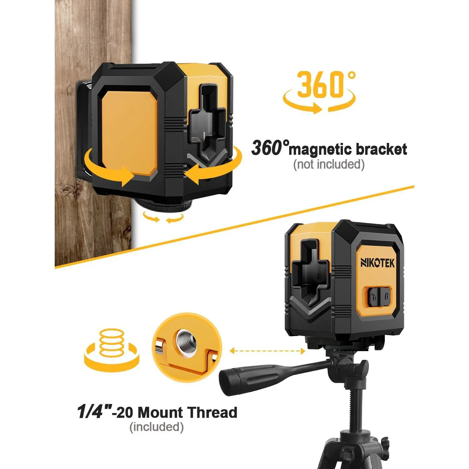 The laser level can be mounted onto a 1/4" -20 tripod or affixed to most metal surface by using the magnetic bracket.