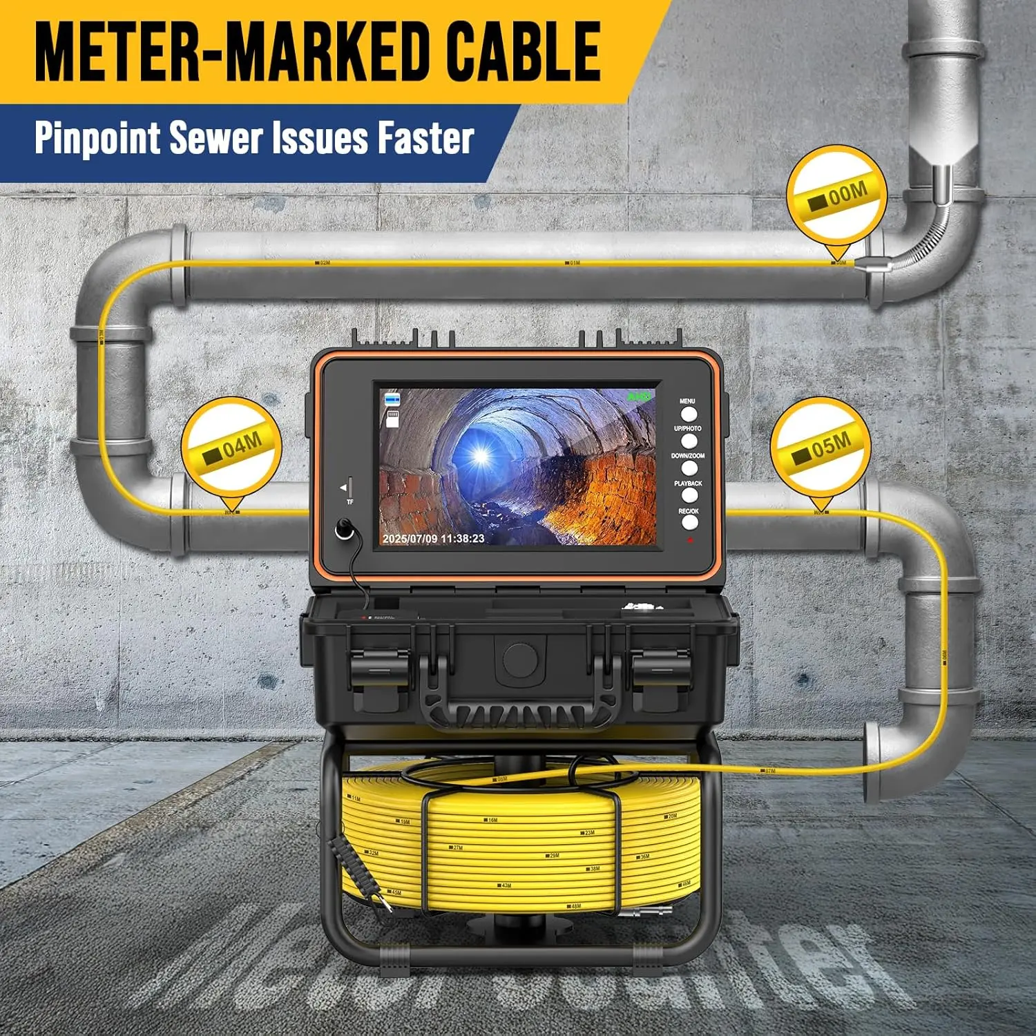 ·Meter-Marked Cable — Measure How Far the Camera Went: The cable is clearly marked every meter, allowing quick on-site distance estimation so you know approximately how deep the camera is and where the issue appears. This simple feature reduces guesswork, prevents unnecessary excavation, and speeds up repair planning—saving time and money on every job.
