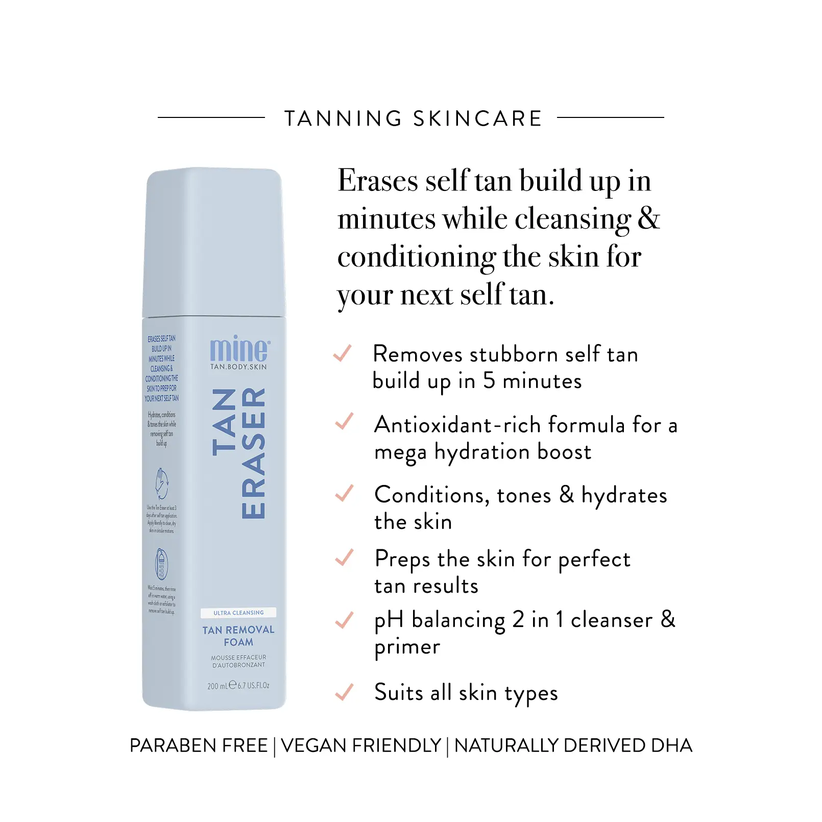 Remove all traces of self tan build up so you can start afresh with your next self tan. Prep and prime your skin before your next tan with this pH balancing 2 in 1 cleanser and primer. Removes all traces of self tan build up to create the perfect starting point for your next self tan. Tan Eraser Cleansing Foam latches onto dirt, oils and your old self tan, gently removing them and leaving your skin with an unparalleled hydrated, conditioning finish. All to make your tan go on smoother, last longer and look more natural. Remove your old tan so you can start afresh and do it all again!