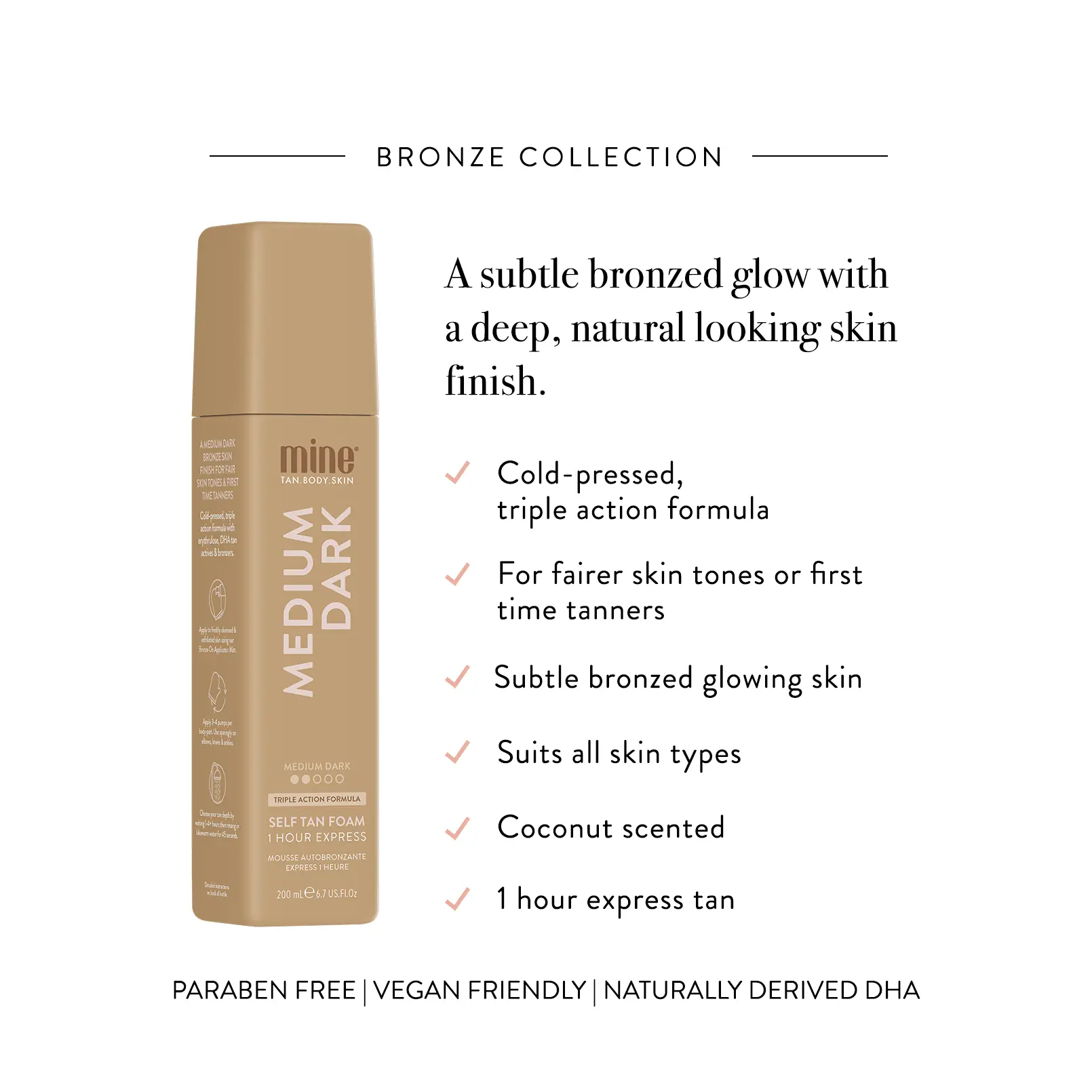 Achieve subtle bronzed, glowing skin in as little as an hour with MineTan Medium Dark Self Tan Foam. Perfect for first time tanners or those with fair complexions.