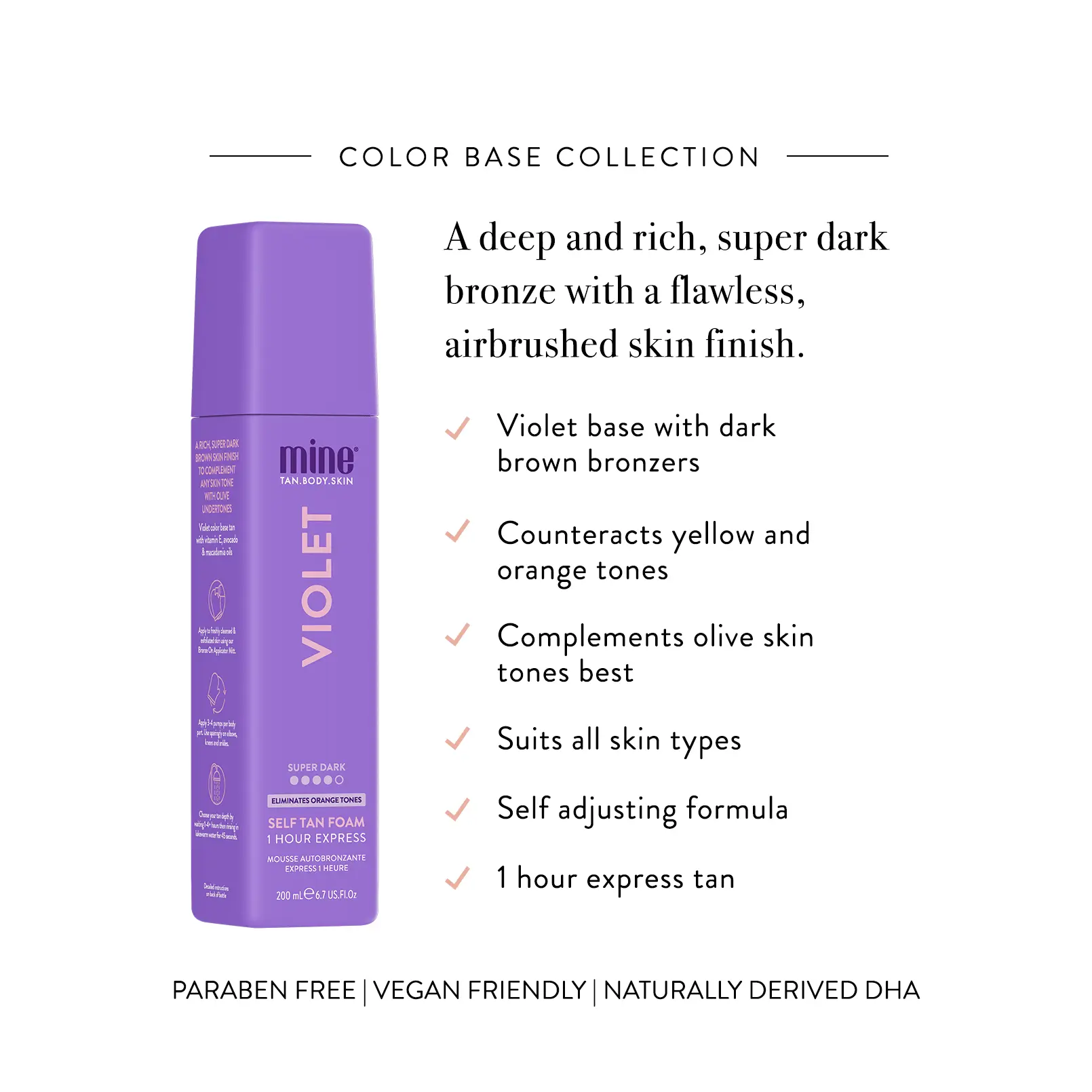 Violet Self Tan Foam suits all skin types and tones for those wanting a rich, warm super dark brown skin finish.