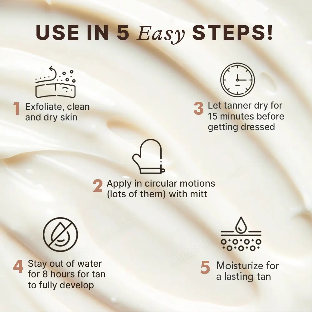 Apply evenly across clean, exfoliated skin with a Tanning Brush or Mitt. Let the rich, creamy texture soak in as you enjoy the tropical coconut scent. Reapply as needed to achieve your desired glow!