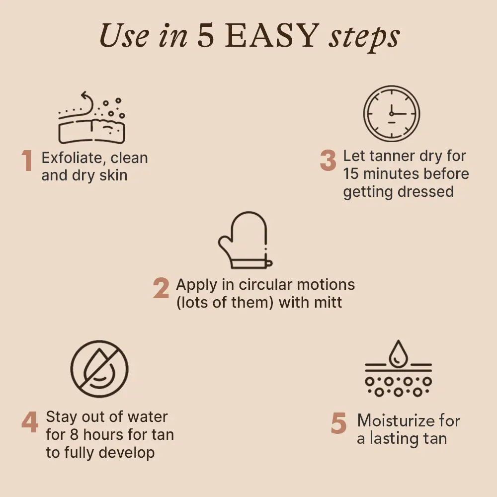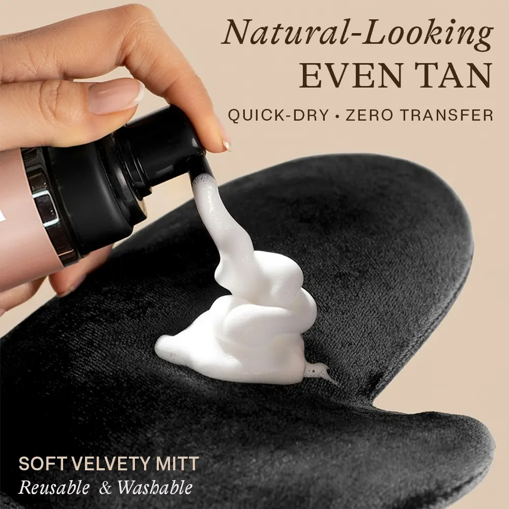 Discover the perfect tan with our Self Tanner Mousse Discovery Kit! ( 1 x Self Tanner Mousse Travel Size 97.5ml + 1 x Applicator Mitt)