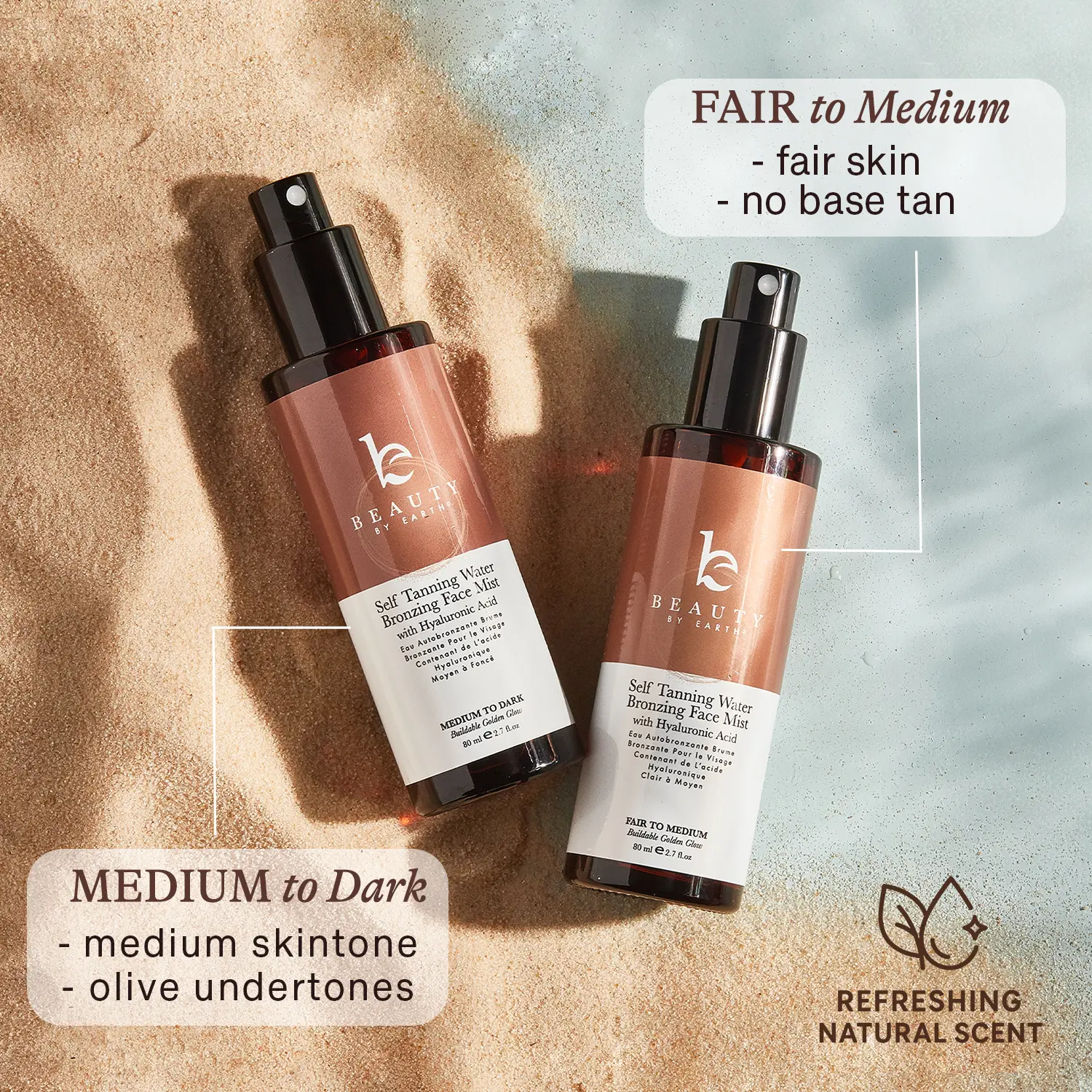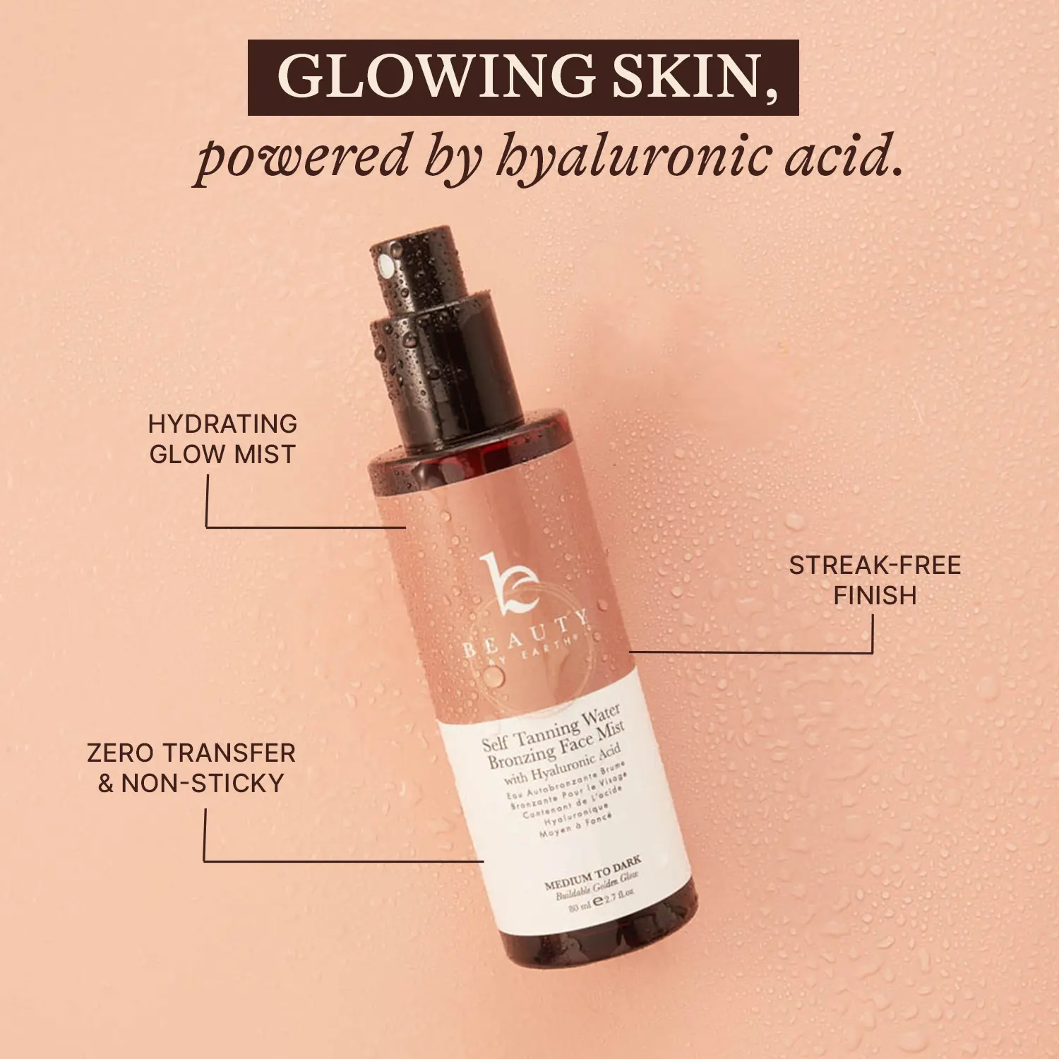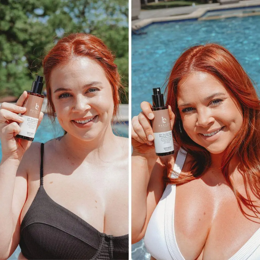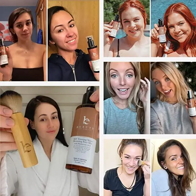 Our Self Tanner Water is a lightweight facial tanning mist that applies like a toner, not a lotion. Just close your eyes, spritz, and let the glow develop in 3–5 hours. No rubbing. No streaking. No residue.