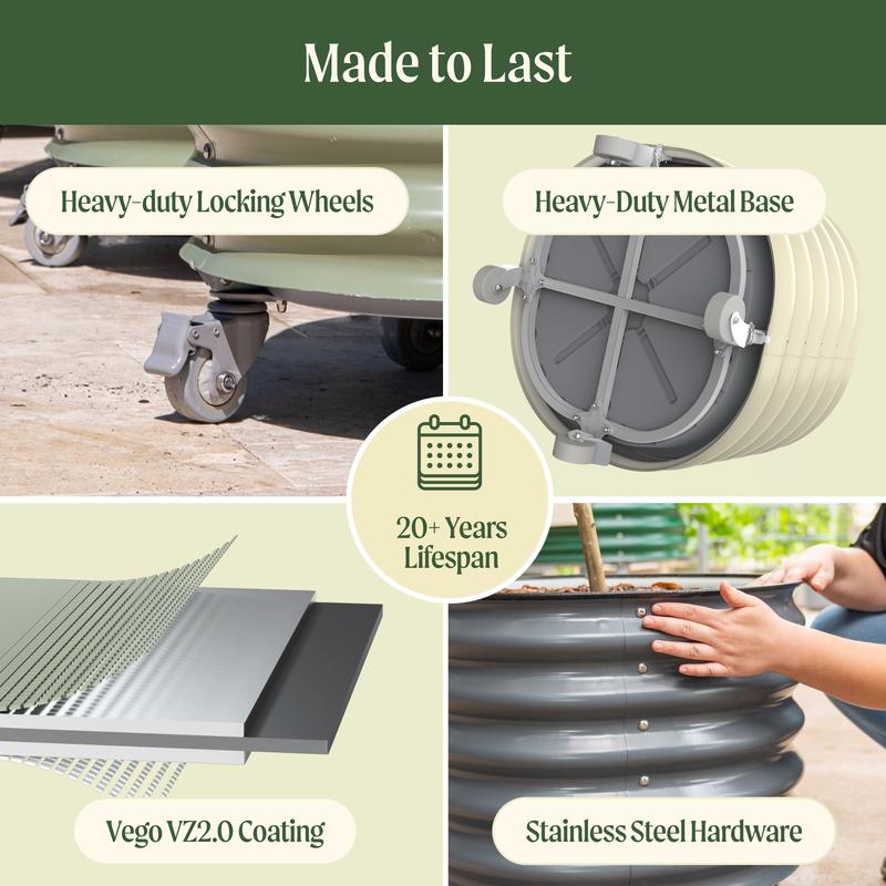 ·Premium Materials: Crafted with quality in mind, the garden bed is made from corrosion-resistant metal (VZ 2.0), hardware features Grade 304 Stainless Steel, and the heavy-duty locking wheels ensure stability and durability.