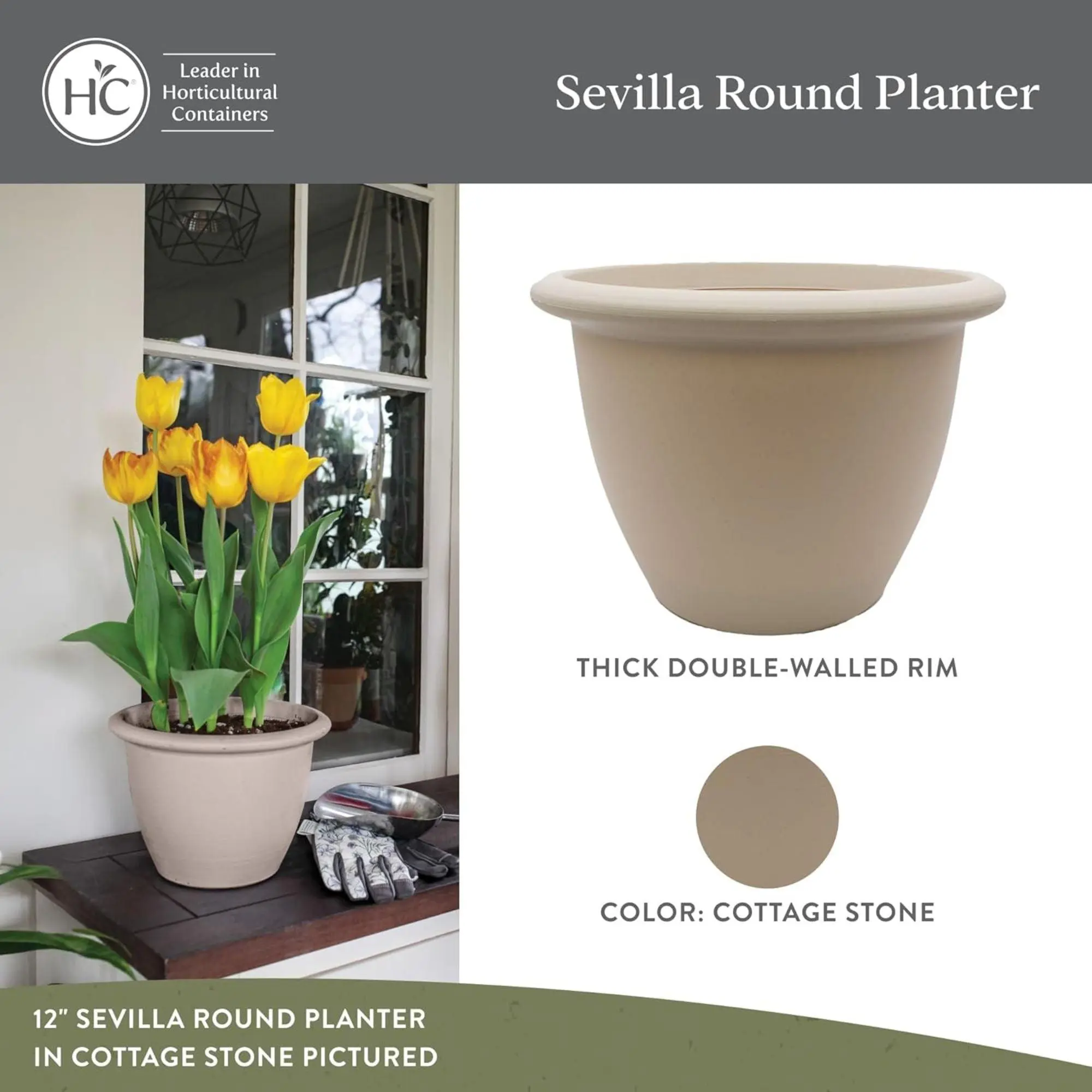 Transform your outdoor and indoor spaces with the elegant and functional Self-Watering Planter by HC Companies. Crafted from weather-resistant resin, the planter measures 12 inches in diameter and 8.75 inches tall, offering a durable yet lightweight solution for all your gardening needs. With its resistance to UV feature, the pots are built to withstand the elements, ensuring they won’t crack or fade over time, maintaining their beauty season after season.The classic design features a brushed texture, creating a stylish, pottery-like finish that adds a sleek touch with a matte finish that resists scratches, dirt, and fingerprints, ensuring that your pot remains pristine. Its classic aesthetic complements any home decor, enhancing indoor and outdoor settings.Equipped with self-watering technology, this planter includes an internal disk that keeps your plants hydrated for days, making plant care a breeze. The design also promotes efficient drainage, ensuring the perfect balance of moisture and oxygen for healthy roots and thriving plants. Ideal for various plants, this self-watering pot is perfect for growing vegetables, flowers, and herbs—indoors or on your patio. Available in multiple sizes, it offers versatility to suit any space.Proudly made in Ohio for over 35 years, HC Companies is committed to producing high-quality horticultural products that you can rely on, supporting local communities, and offering lasting solutions for gardening enthusiasts.