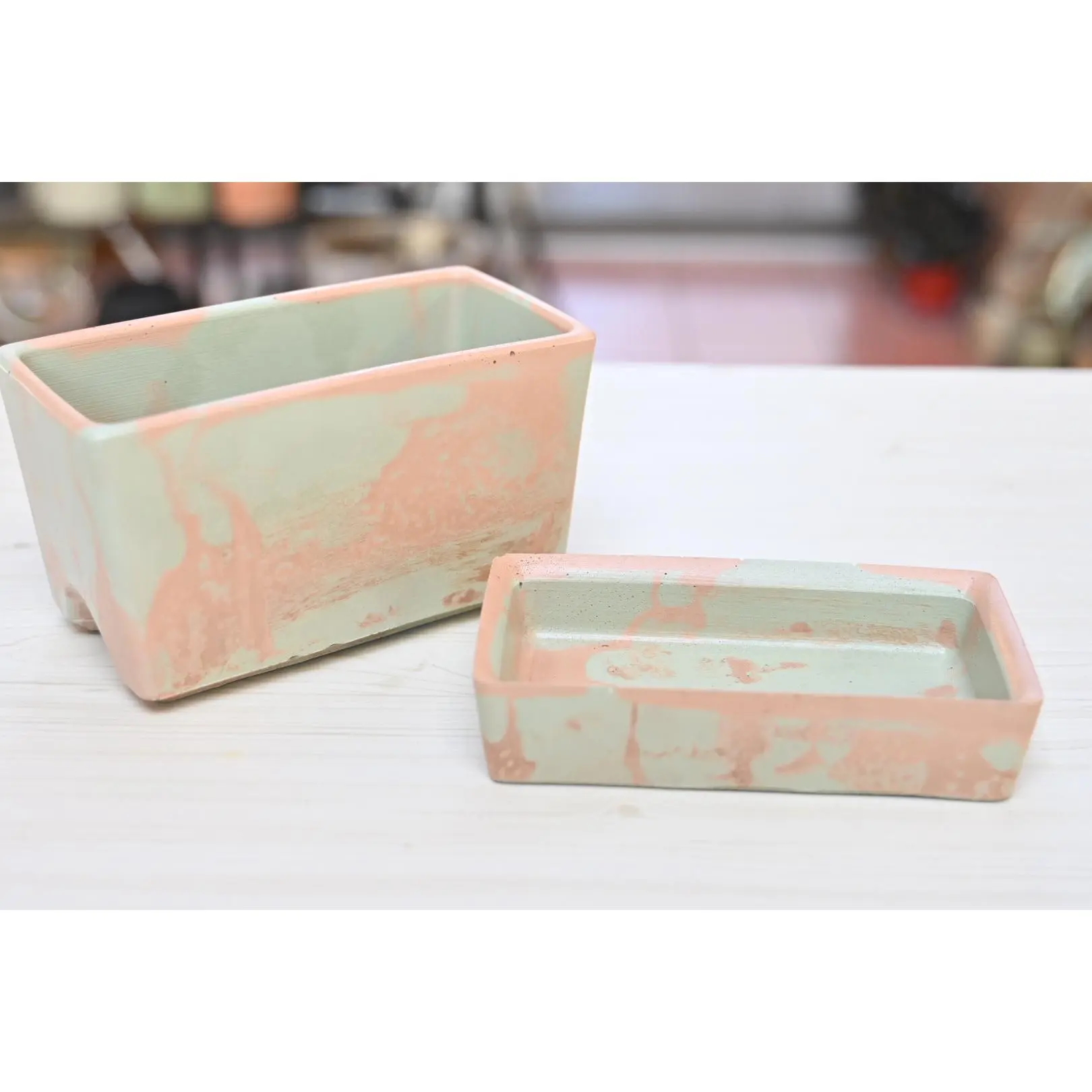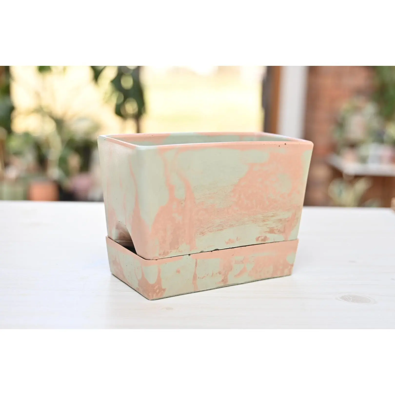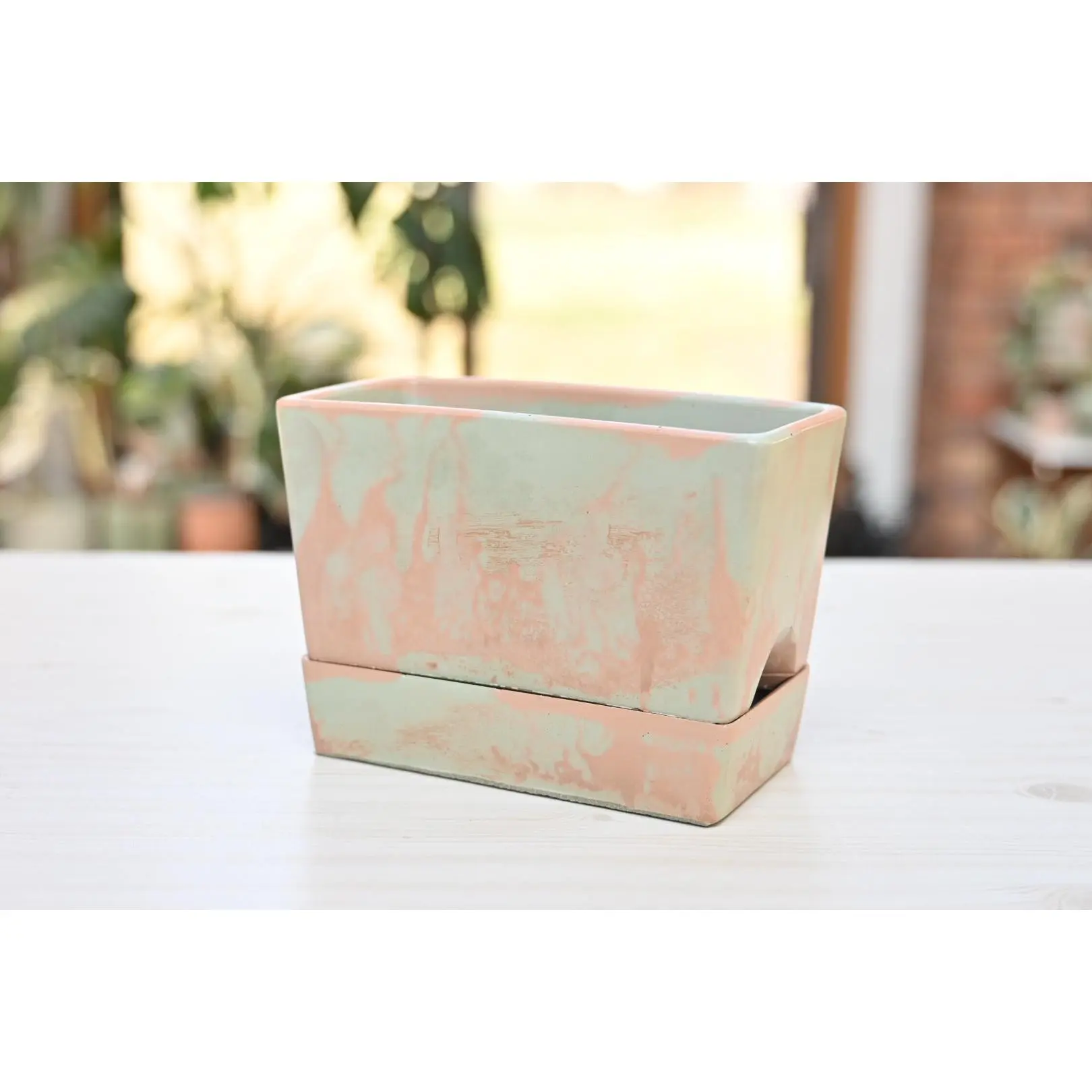 This 7X4 self-watering rectangle box planter is completely one of a kind. A unique beauty with layered tones and soft marbling that feels deep and mesmerizing.