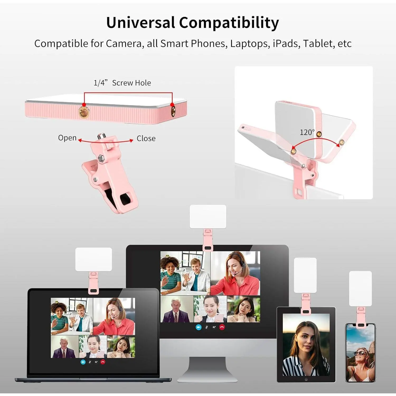 【Two Kinds Installation Design】It includes two mounts: a phone light clip with adjustable tilt, positioning on your mobile phone, laptop, iPad, tablet, mirror, or bedside. The clip opening is designed with silicone to prevent scratching and falling off. Phone clip can also be rotated 360° to adjust the direction and angle of the selfie light. An adapter embedded with 1/4” thread for cameras, tripods, selfie sticks, light stand, etc, makes it ideal for photography, video recording or traveling.