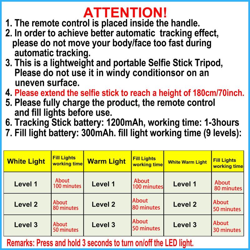 Attention: Please extend the selfie stick to reach a height of 180cm/70inch.