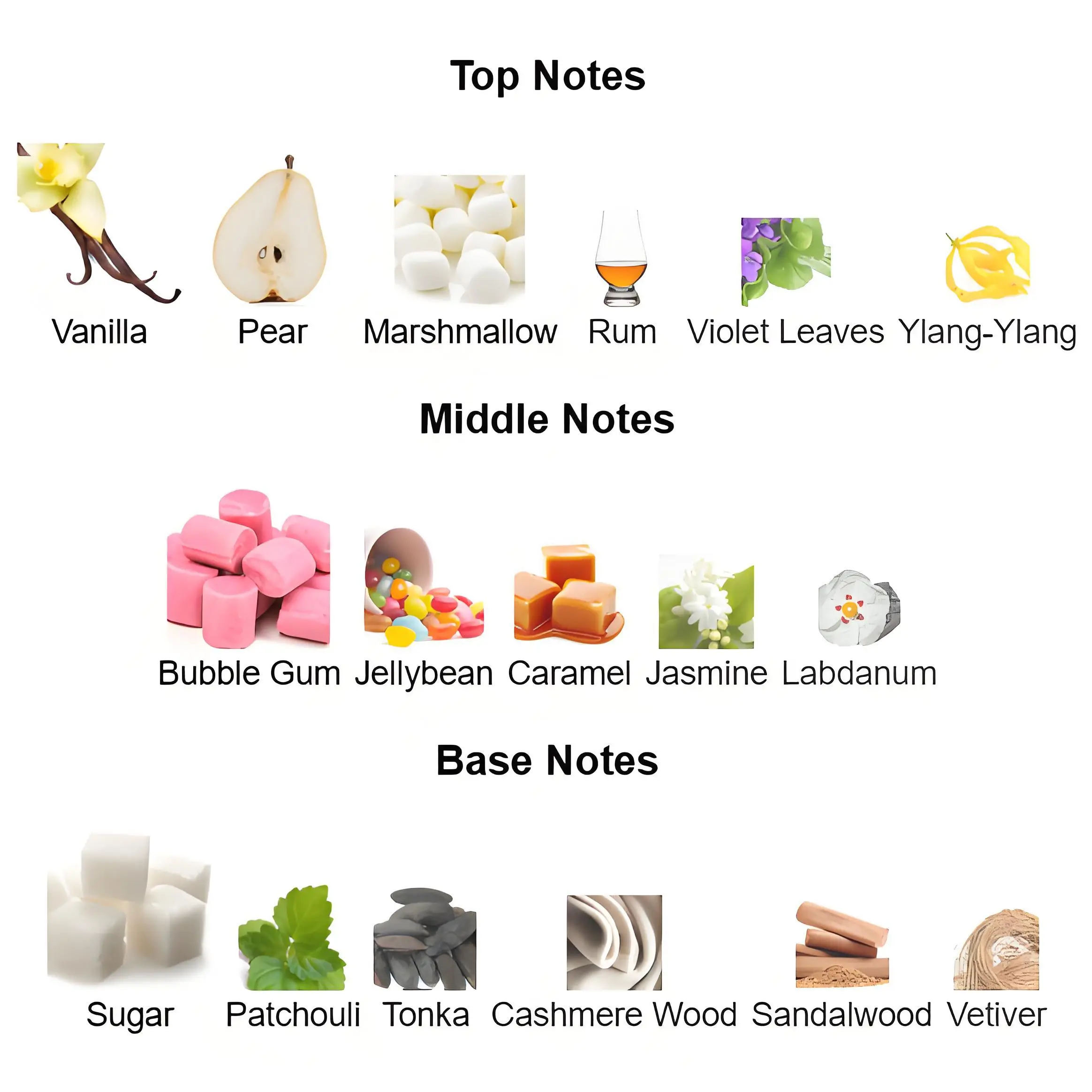 ·Middle notes are Bubble Gum, Jellybean, Caramel, Jasmine and Labdanum;